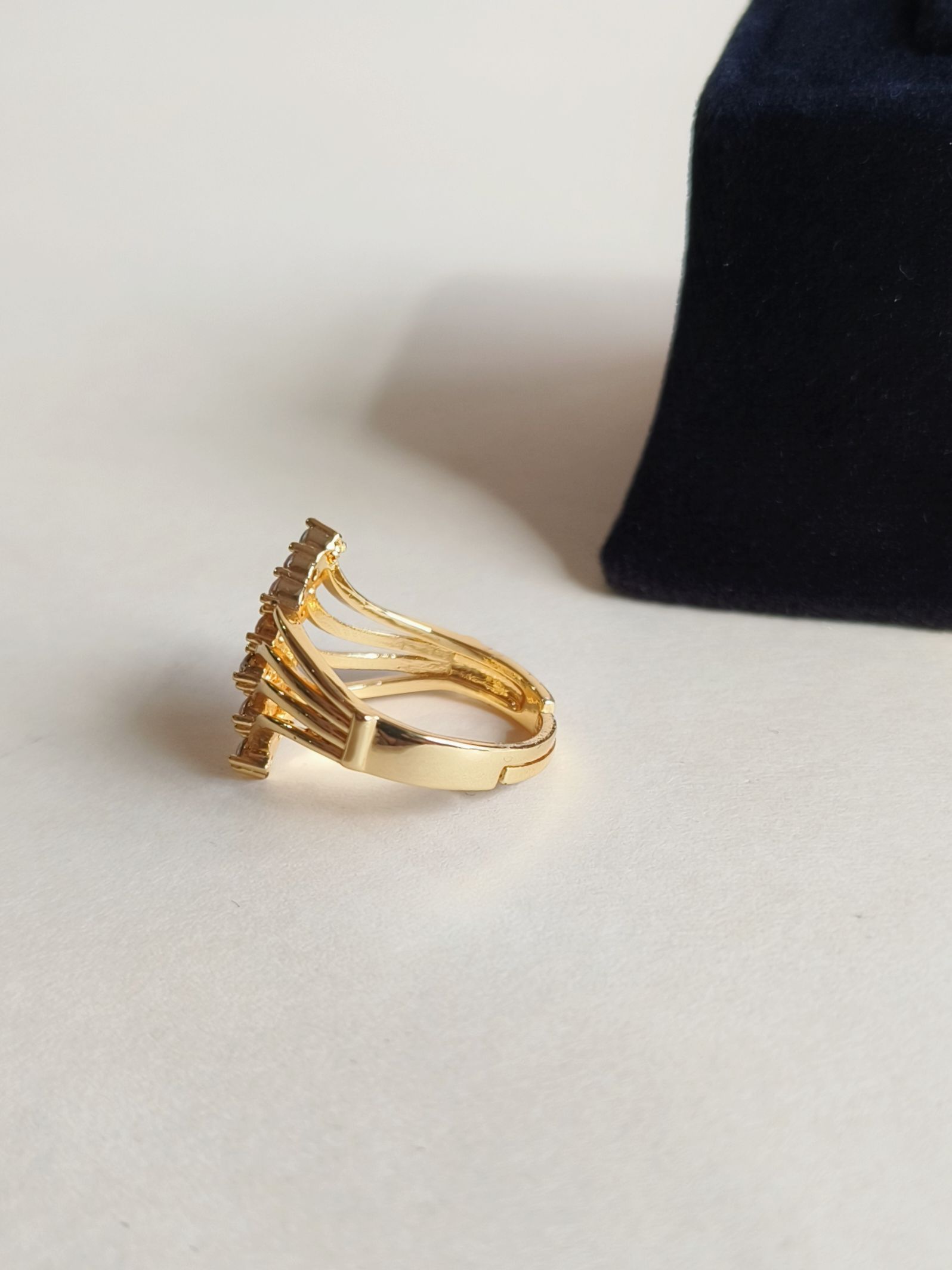 Beautifully crafted adjustable finger ring made with high-quality brass, premium polish, and high-finish plating. Studded with shiny American Diamonds for an elegant sparkle. The adjustable design comfortably fits most finger sizes.