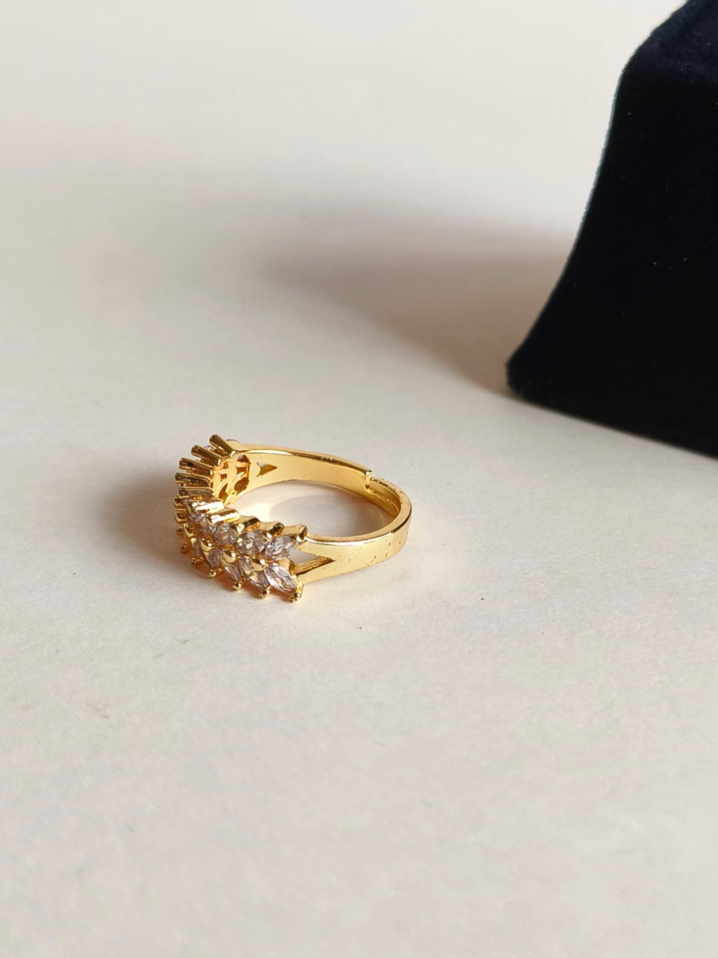 Beautifully crafted adjustable finger ring made with high-quality brass, premium polish, and high-finish plating. Studded with shiny American Diamonds for an elegant sparkle. The adjustable design comfortably fits most finger sizes.