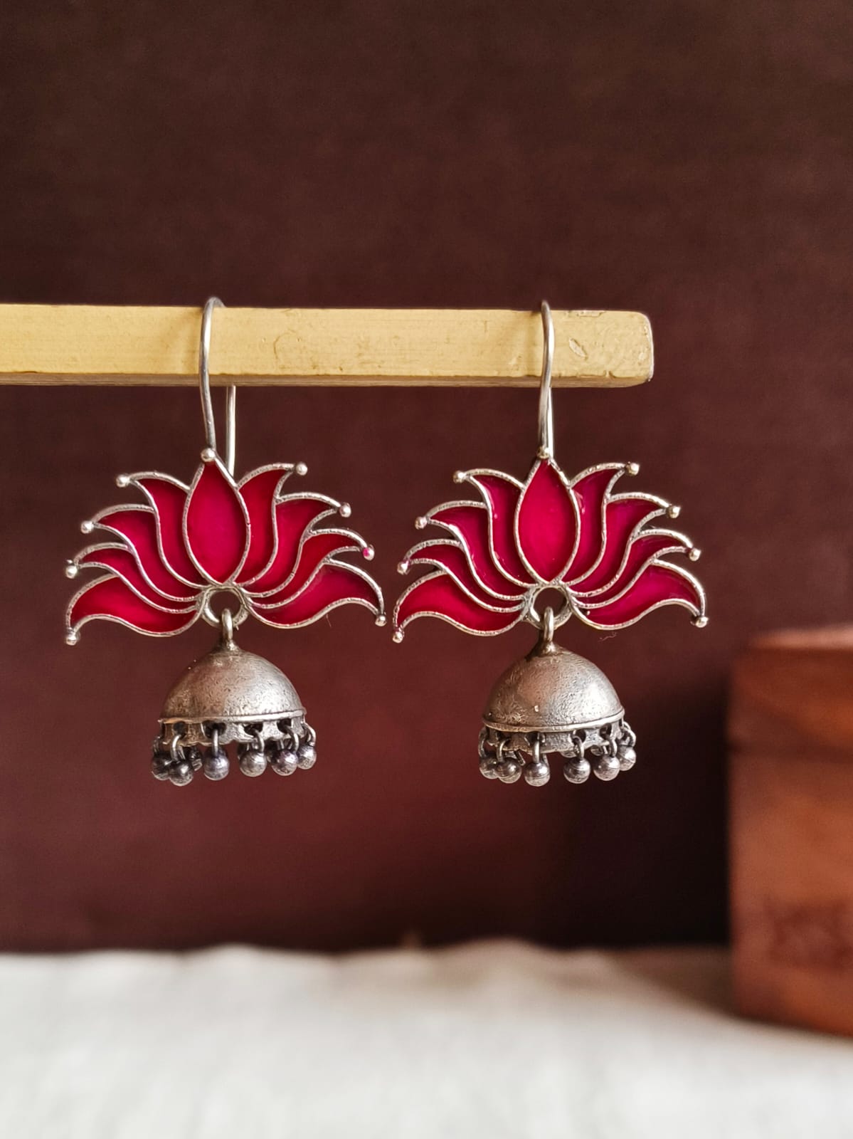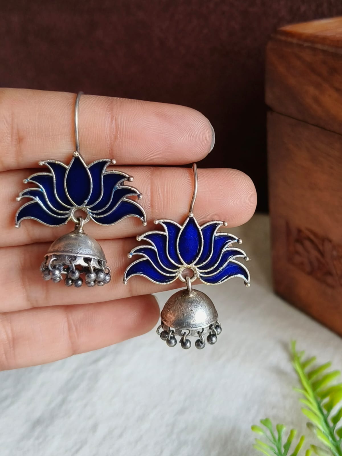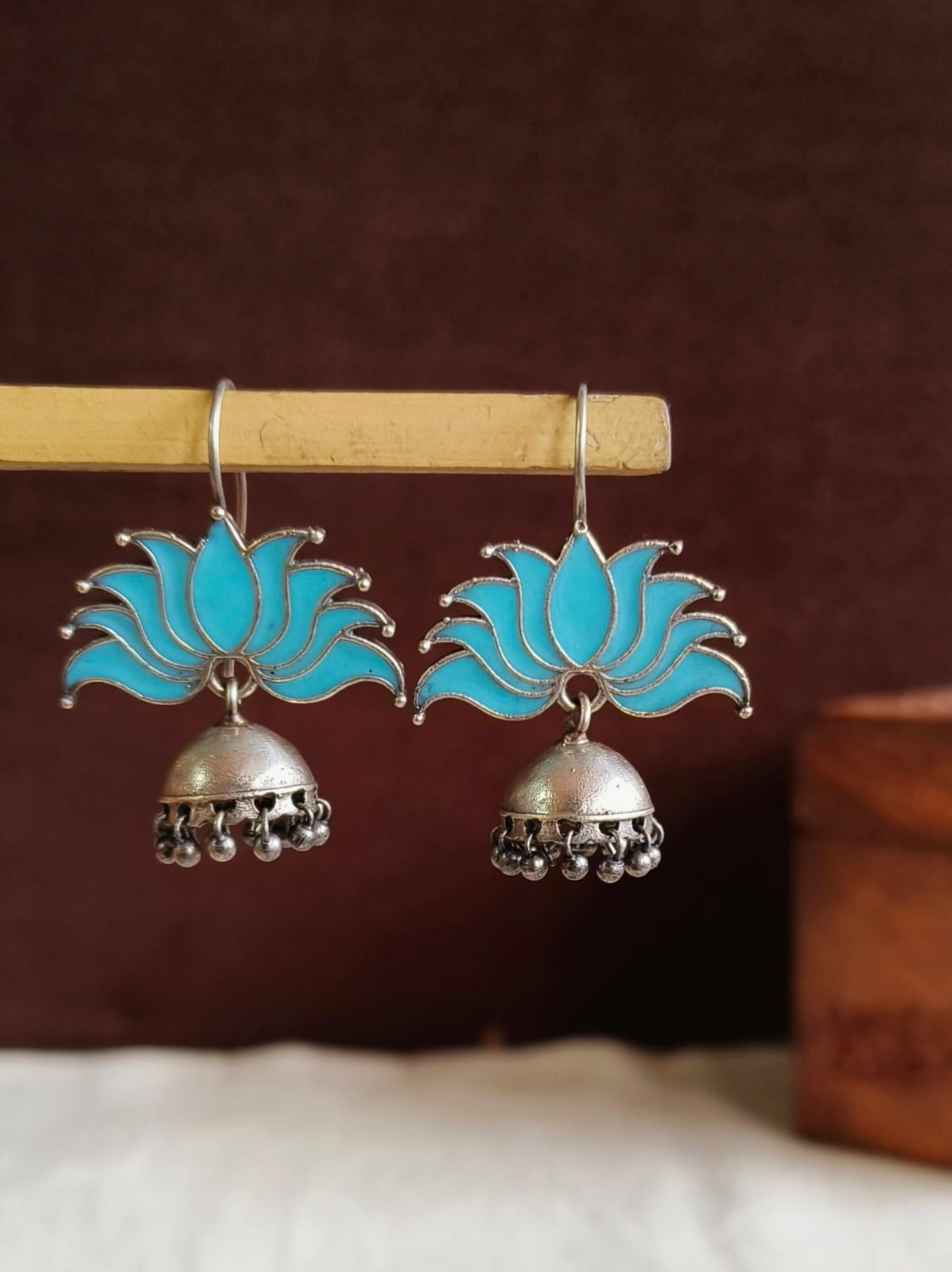 Add some flair to your jewelry collection by wearing the Lotus oxidized Jhumka Earrings designed and meticulously made using brass and enamel. They are timeless in their elegance and class, which makes them an ideal accessory to complement both modern and traditional styles. They are beautiful peacocks with sophisticated design and an oxidized look making them perfect for every occasion from weddings to celebrations.