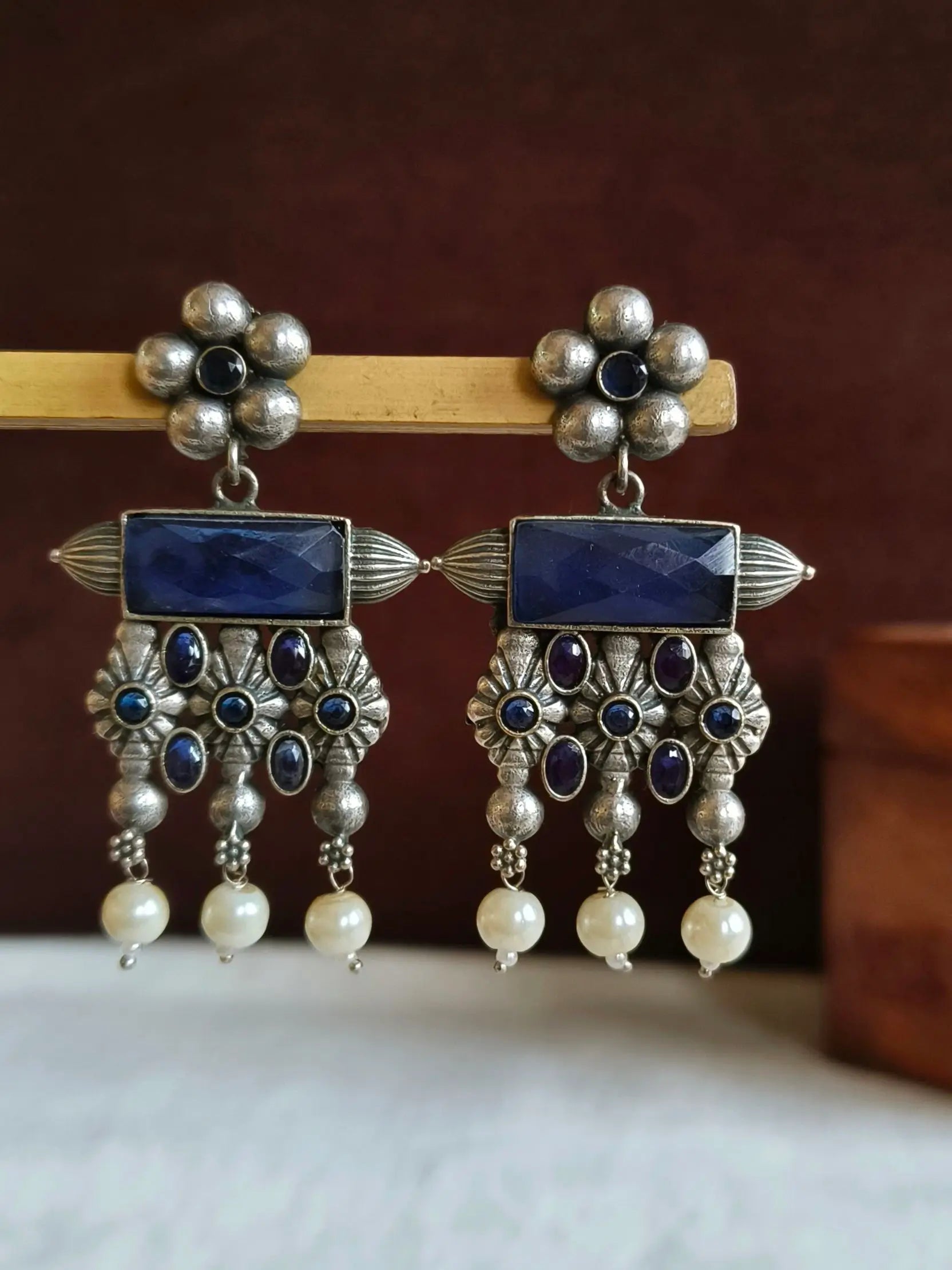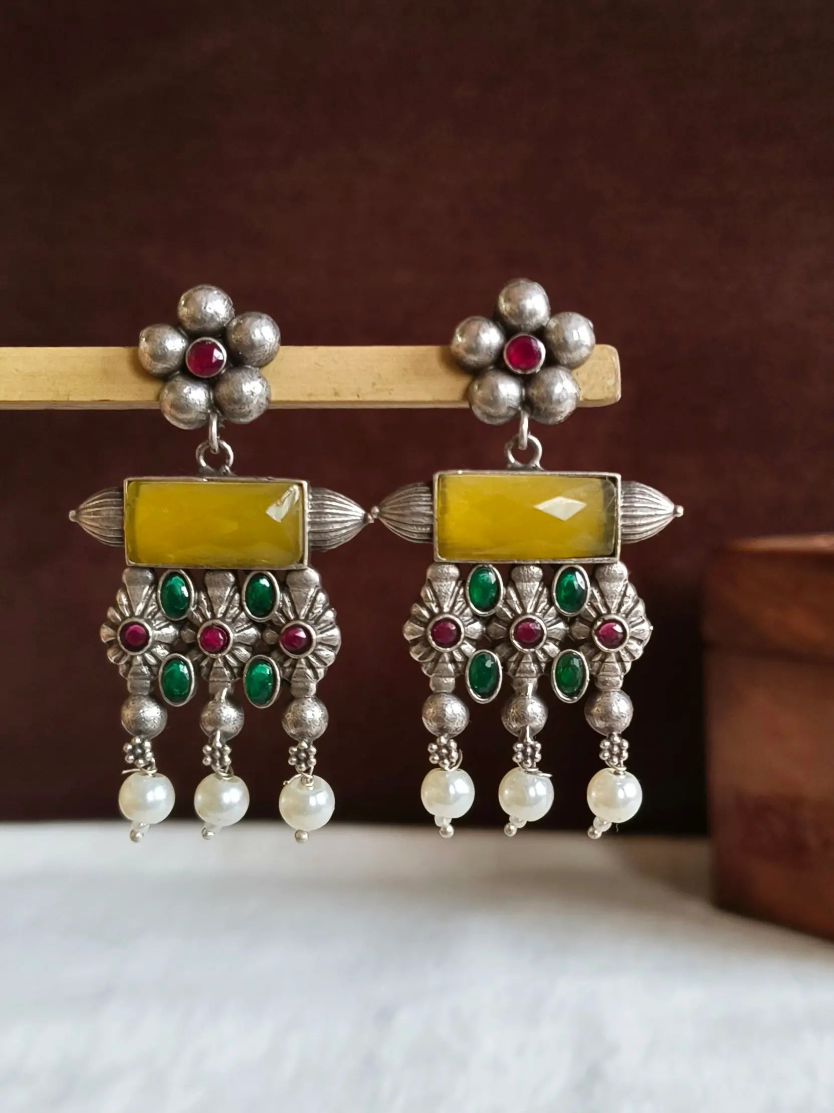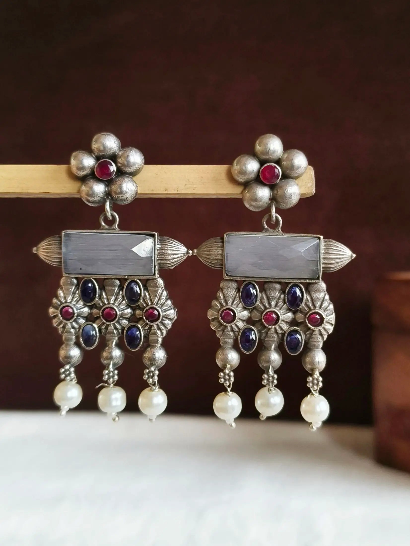Enhance your look by wearing our antique Oxidised Meenakari Earrings. A striking blend of traditional and class. The exquisite earrings are made of high-end brass, with exquisite silver plating. They are created to add a hint timeless elegance to any style. The exquisite Meenakari piece showcases vivid enamels that are hand-painted to bring a pop of elegance and color.