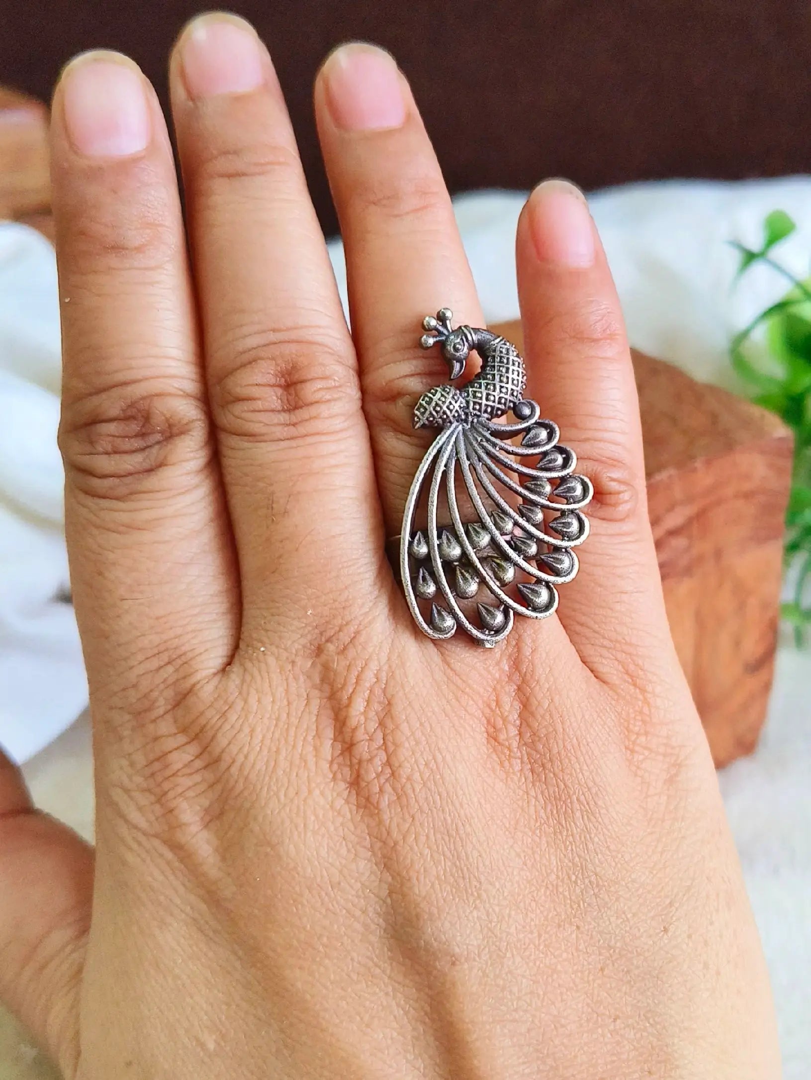 Add a touch of heritage charm with this Oxidised Silver Plated Peacock Ring from Sarichka. Crafted with an antique oxidised finish, this adjustable ring showcases an intricately detailed peacock motif, symbolizing beauty and grace. Its timeless design makes it a versatile accessory for weddings, festive wear, casual outings, and daily wear. Lightweight yet durable, it offers a comfortable fit and elevates any outfit effortlessly. Also makes a thoughtful gift option for jewelry lovers.