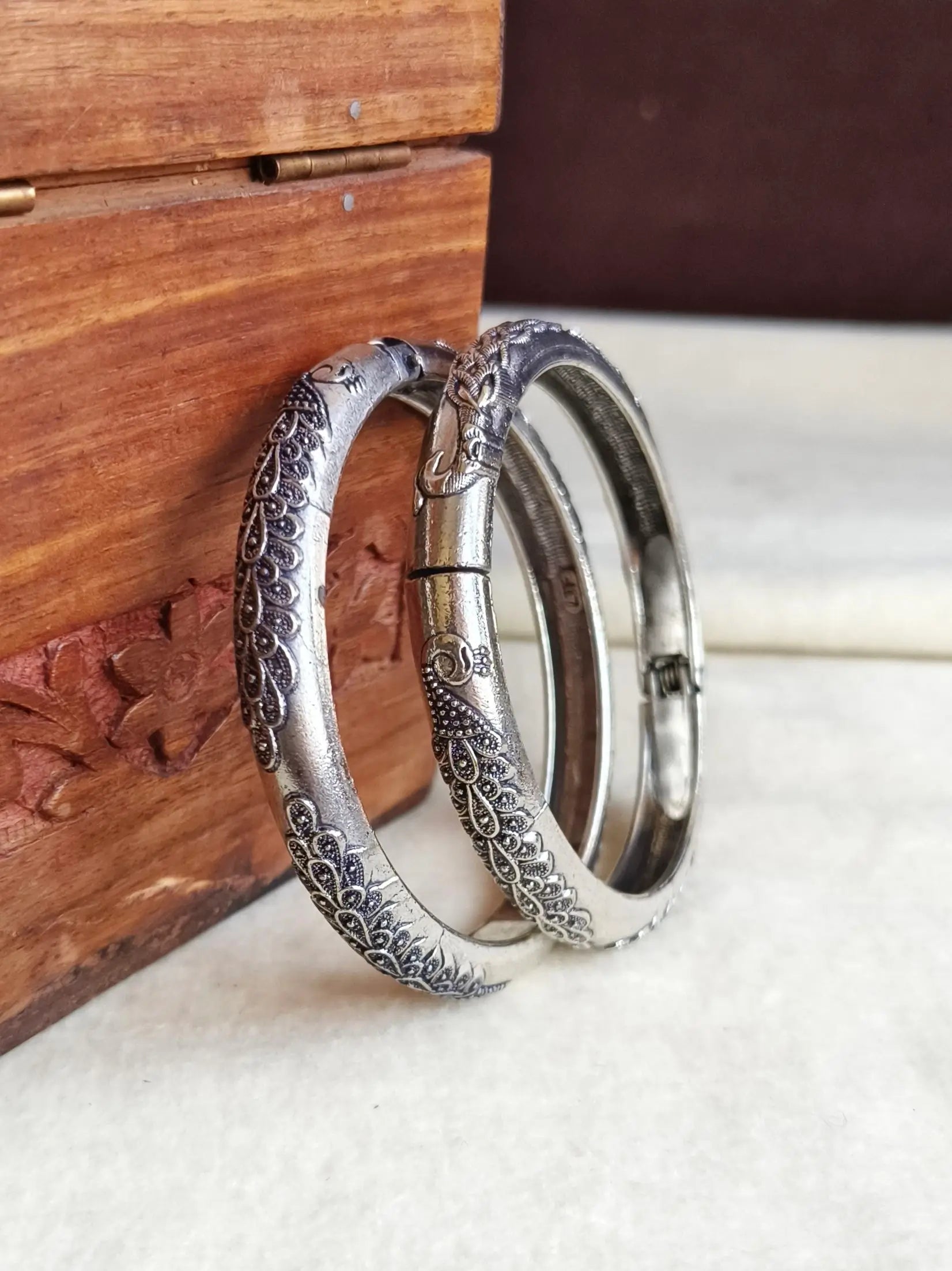 Unveil timeless grace with Sarichka Fashion’s German Silver Openable Peacock Kadas. Designed in a stunning antique silver finish, these kadas showcase beautifully detailed peacock motifs, symbolizing elegance and vibrance. The openable mechanism ensures hassle-free wear and a secure fit, making them suitable for festive occasions and traditional events.