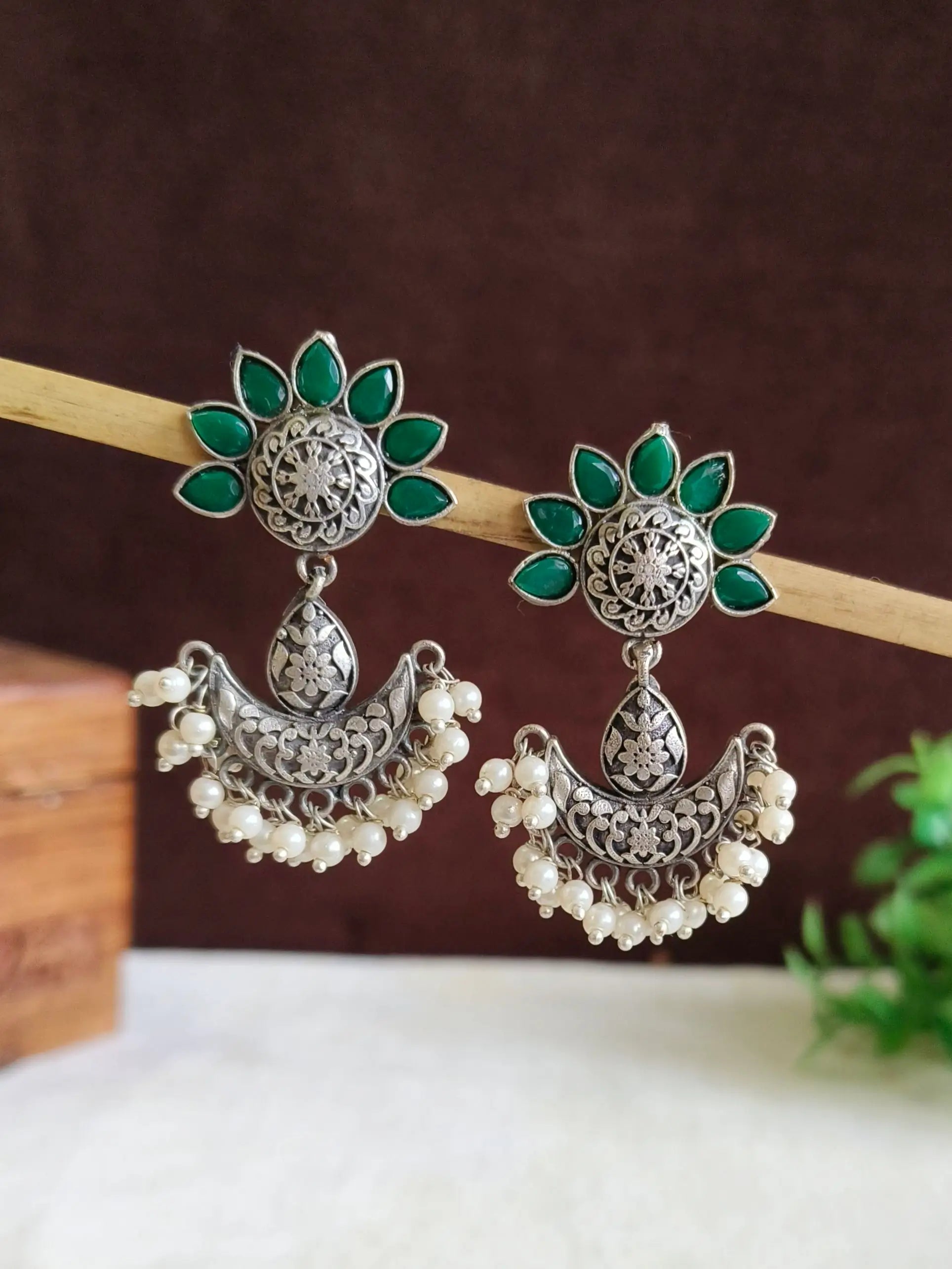 Add timeless elegance to your collection with these Silver-Plated Classic Oxidised Gemstone Dangler Earrings from Sarichka. Designed with a graceful oxidised silver finish and embellished with striking gemstone accents, these earrings balance tradition with contemporary flair. Lightweight yet eye-catching, they are perfect for elevating any outfit.