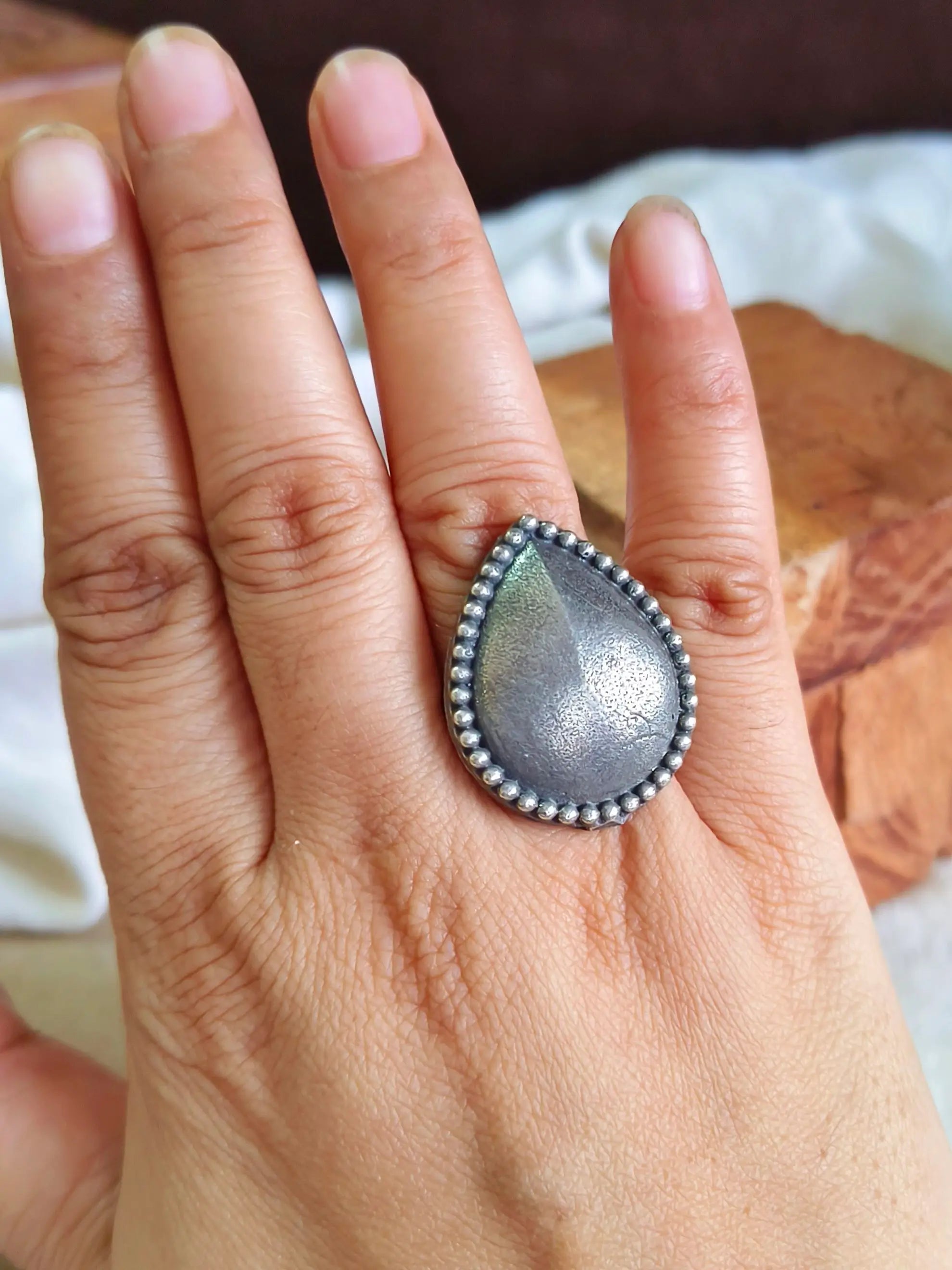 Elevate your jewelry collection with this Silver Plated Oxidised Pear Shape Ring from Sarichka. Crafted with an antique oxidised finish, this ring features a stunning pear-shaped design that reflects timeless elegance. The adjustable band ensures a perfect fit, making it both comfortable and versatile. Its unique oxidised detailing adds a touch of charm, ideal for daily wear, festive occasions, or parties. Lightweight yet eye-catching, it’s also a thoughtful gift option for loved ones.