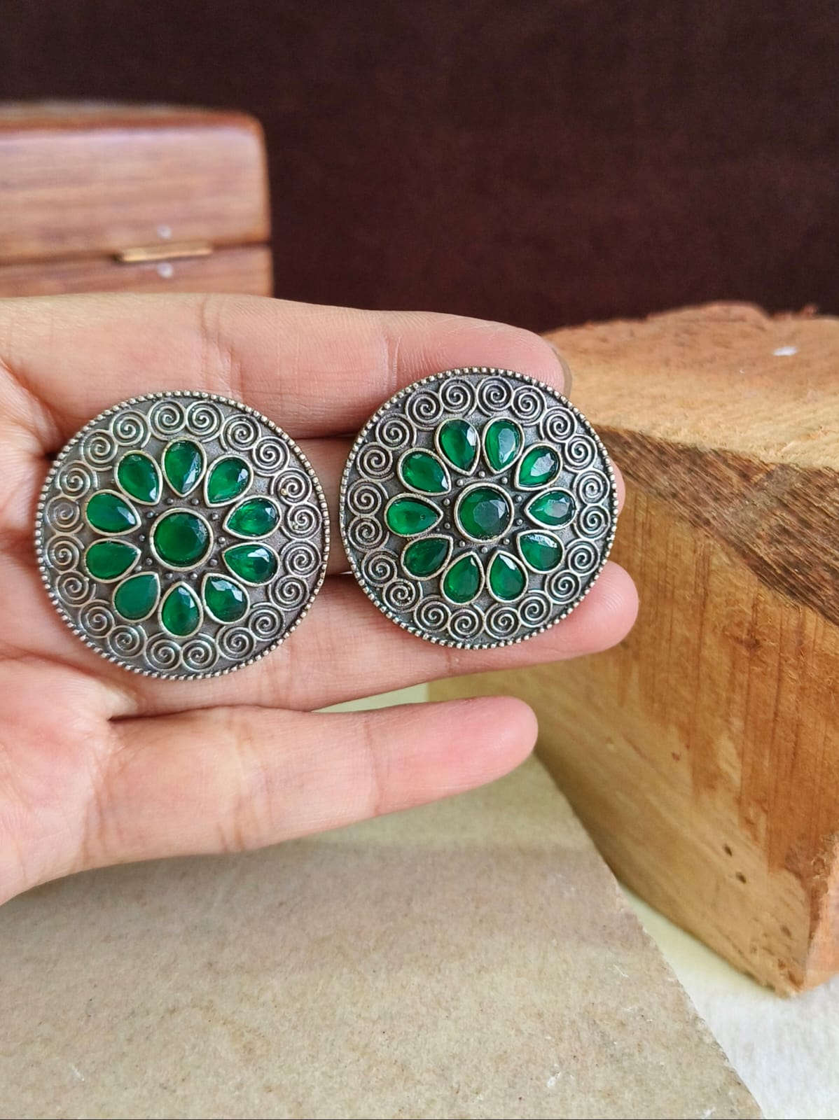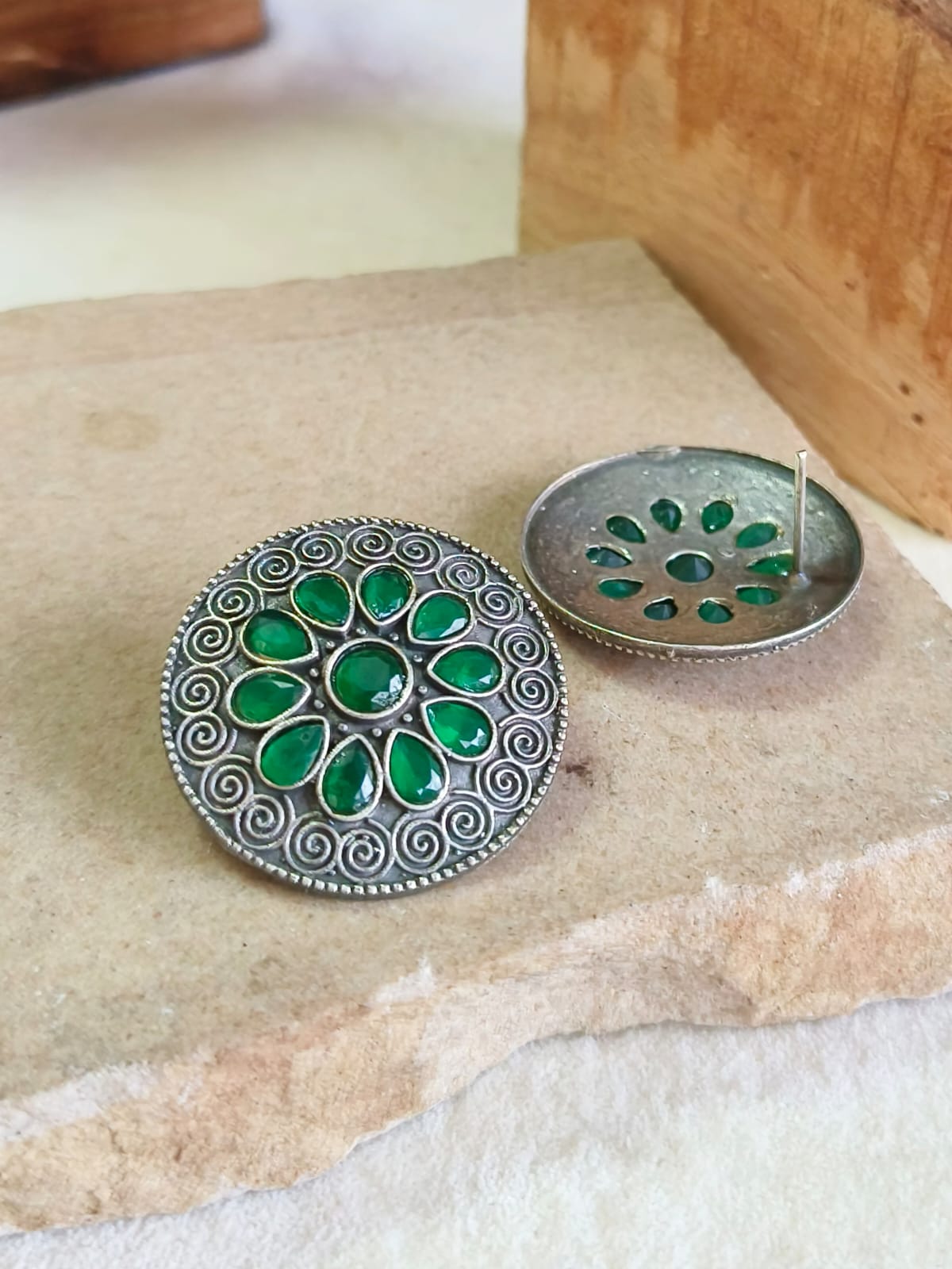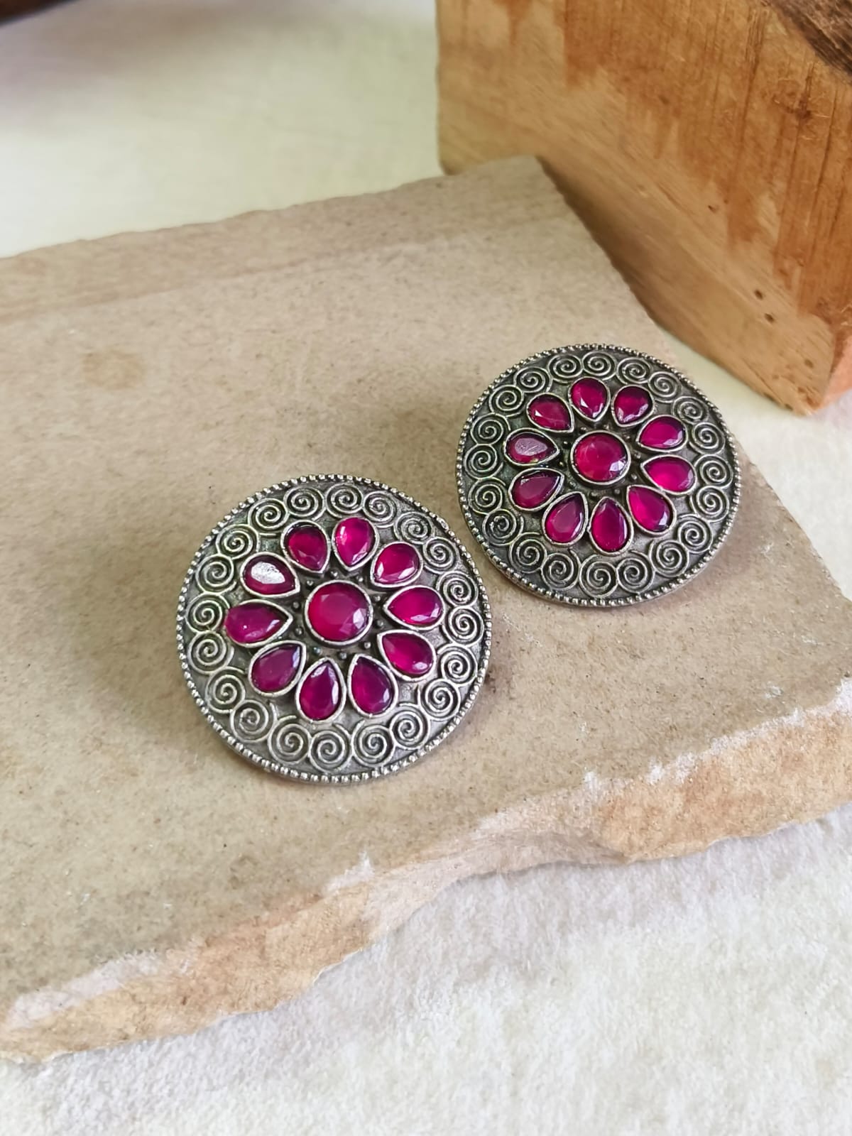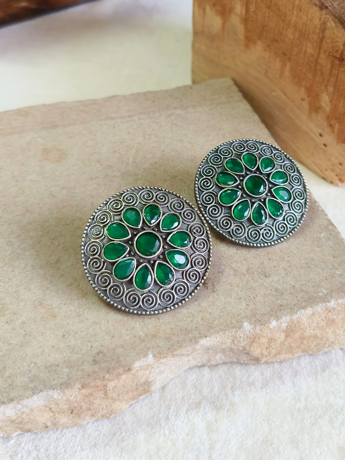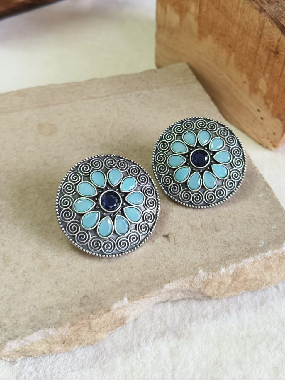 Silver Oxidised Round Gemstone Stud Earrings for Women