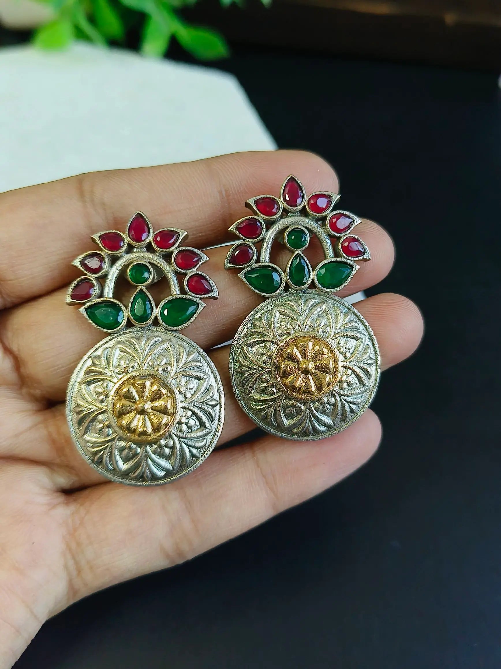 These dual Tone Oxidised Studs have a distinctive combination of oxidised metal and brass hues which creates a stunning visual contrast. The finely detailed design shows the skill of skilled artists, while the sparkling pearls convey a feeling of pureness and elegance. The harmonious mix of hues and textures makes these earrings an ideal accessory easily blending with both classic and contemporary styles.