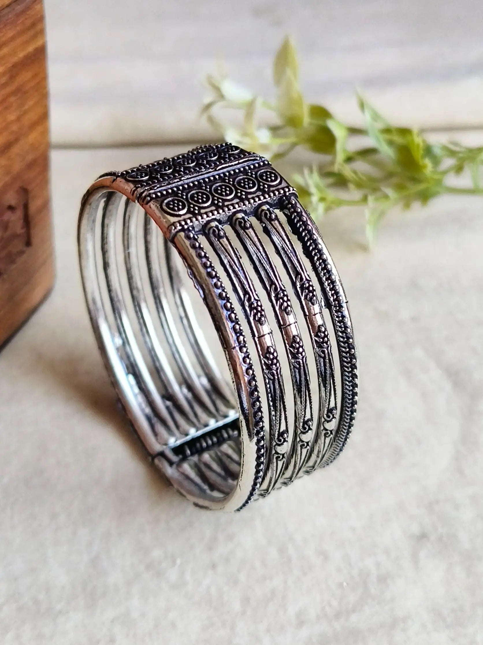 Celebrate Navratri with timeless elegance in Sarichka Fashion’s German Silver Openable Kadas. Finished in antique silver polish, these kadas feature detailed ethnic engravings, blending traditional artistry with everyday comfort through their openable design.