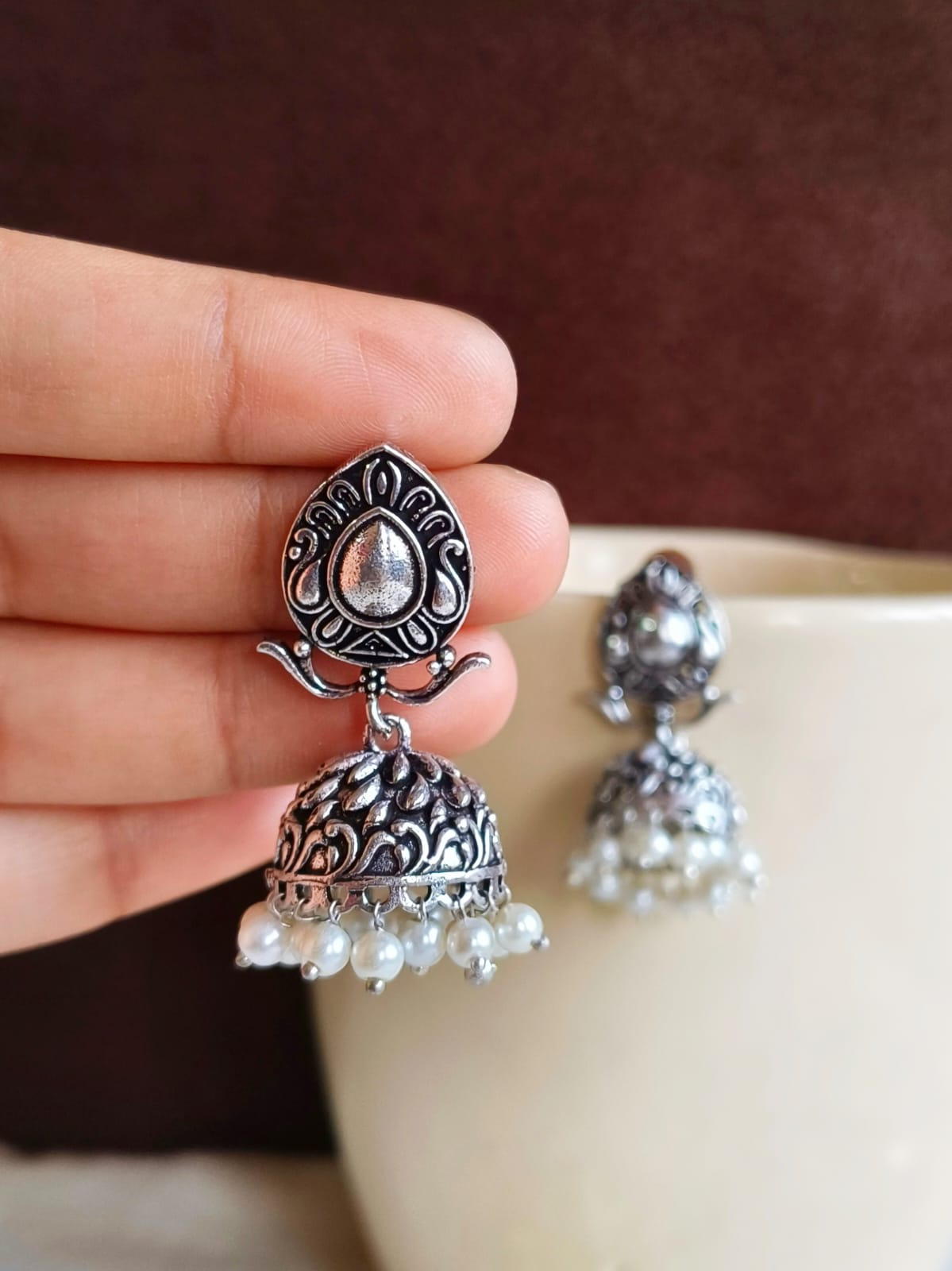 Add a touch of elegance to your ethnic wear with these German silver pearl jhumka earrings, featuring intricate floral designs and delicate pearls. These versatile earrings are perfect for weddings, festive occasions, or party wear, making them a great addition to any jewelry collection.