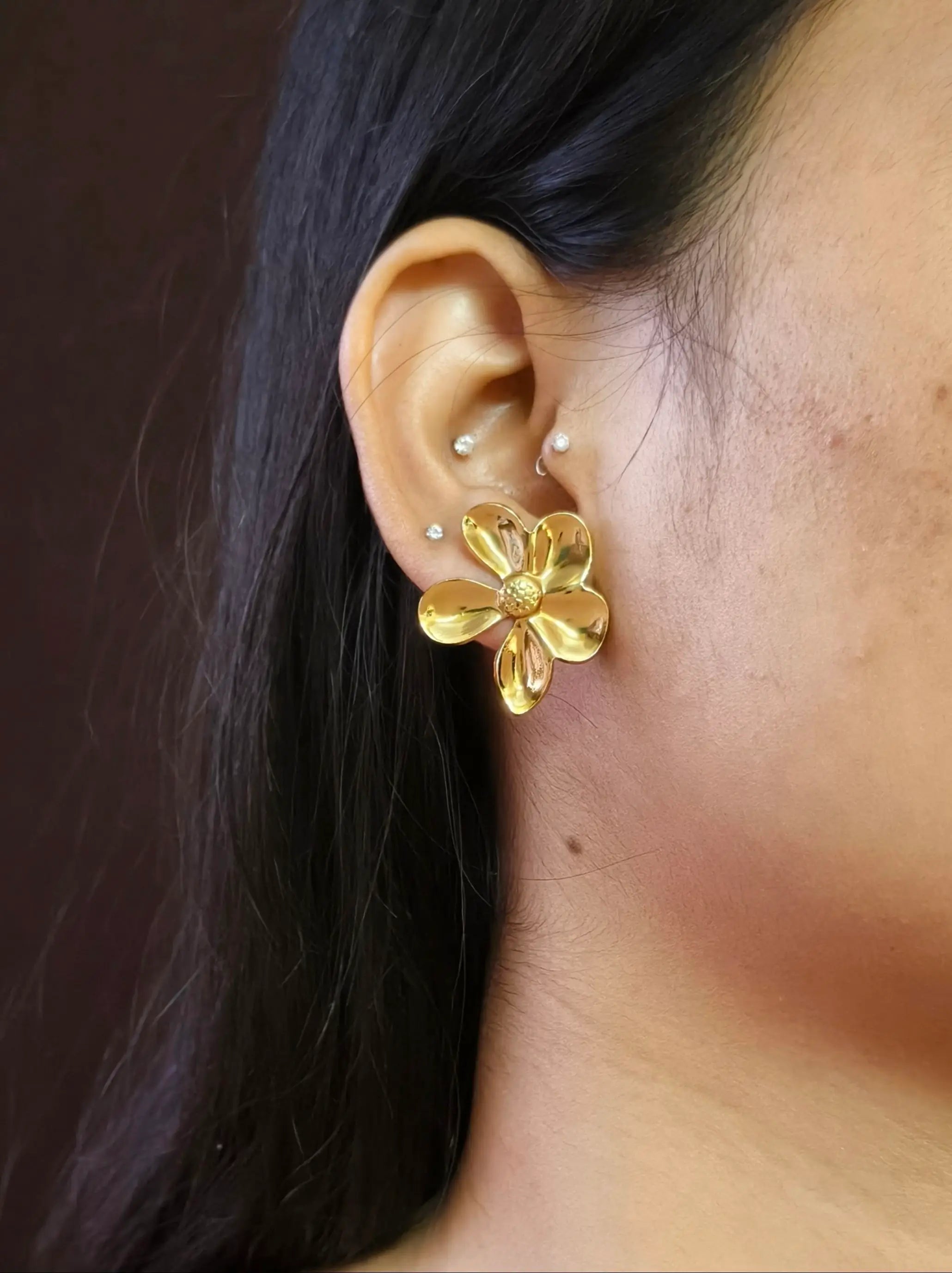 Elevate your elegance with these Gold Plated Floral Style Anti-Tarnish Studs, crafted in premium stainless steel for long-lasting shine and durability. The charming floral motif, finished in a radiant golden polish, adds a feminine and stylish touch to any look. Perfect for office wear, casual outings, festive moments, or daily styling, these lightweight studs offer both beauty and comfort. Their refined design makes them a thoughtful gift choice for loved ones. Pair them effortlessly with western, traditional, or fusion outfits, making them a must-have addition to your jewelry collection.