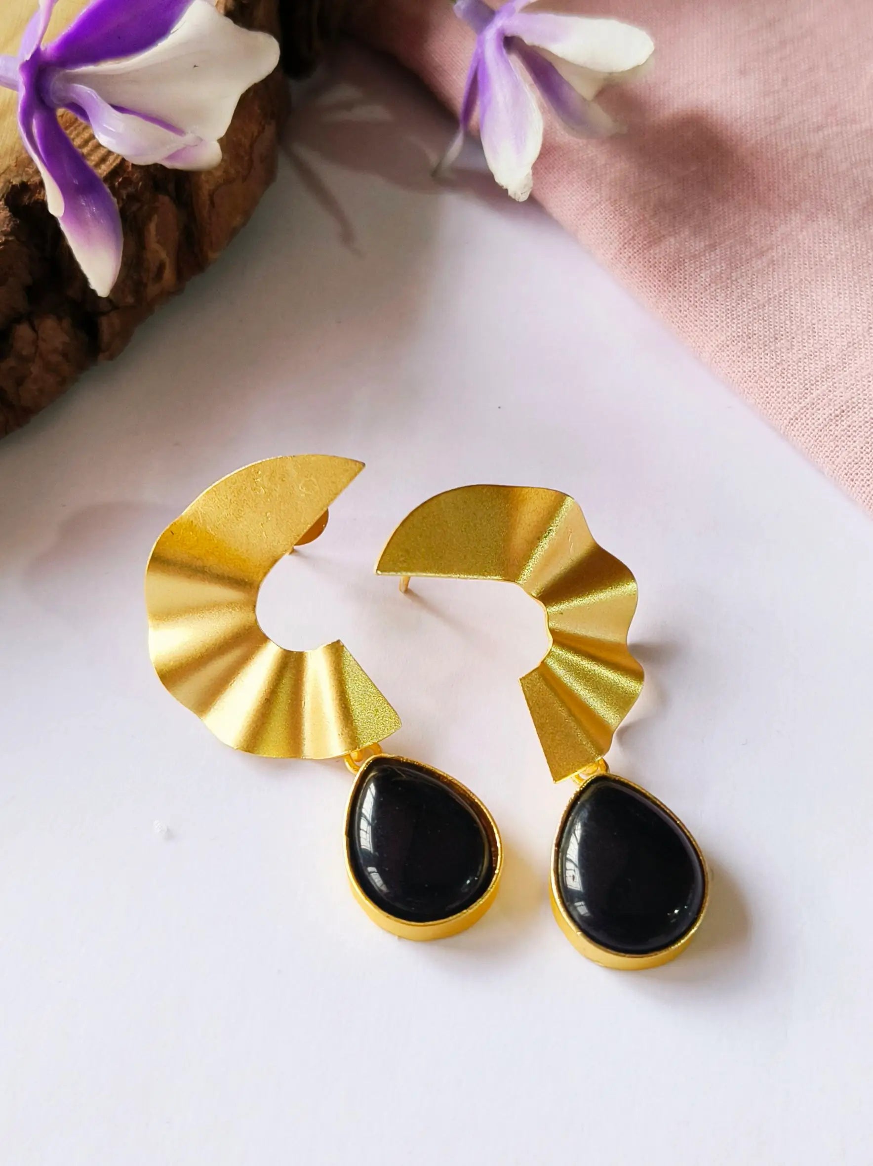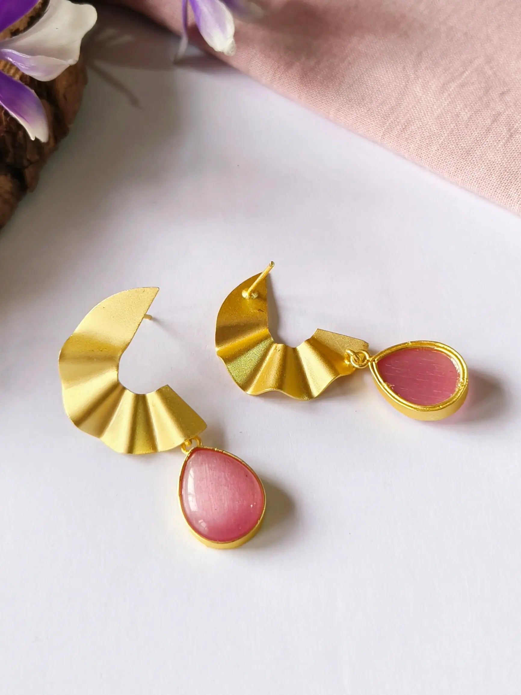 Elevate your elegance with these stunning golden-polish brass dangler earrings, adorned with rich maroon Monalisa stones for a classy, timeless appeal. Their sleek design makes them perfect for party wear, festive looks, weddings, and stylish outings. A thoughtful gift option for someone who loves refined fashion.