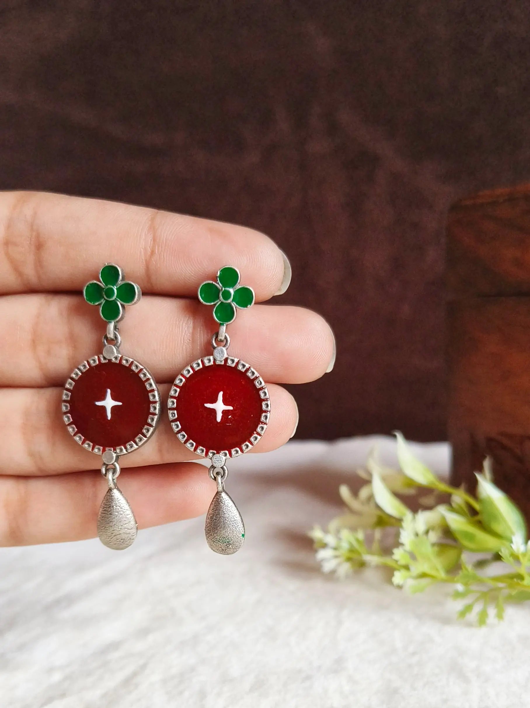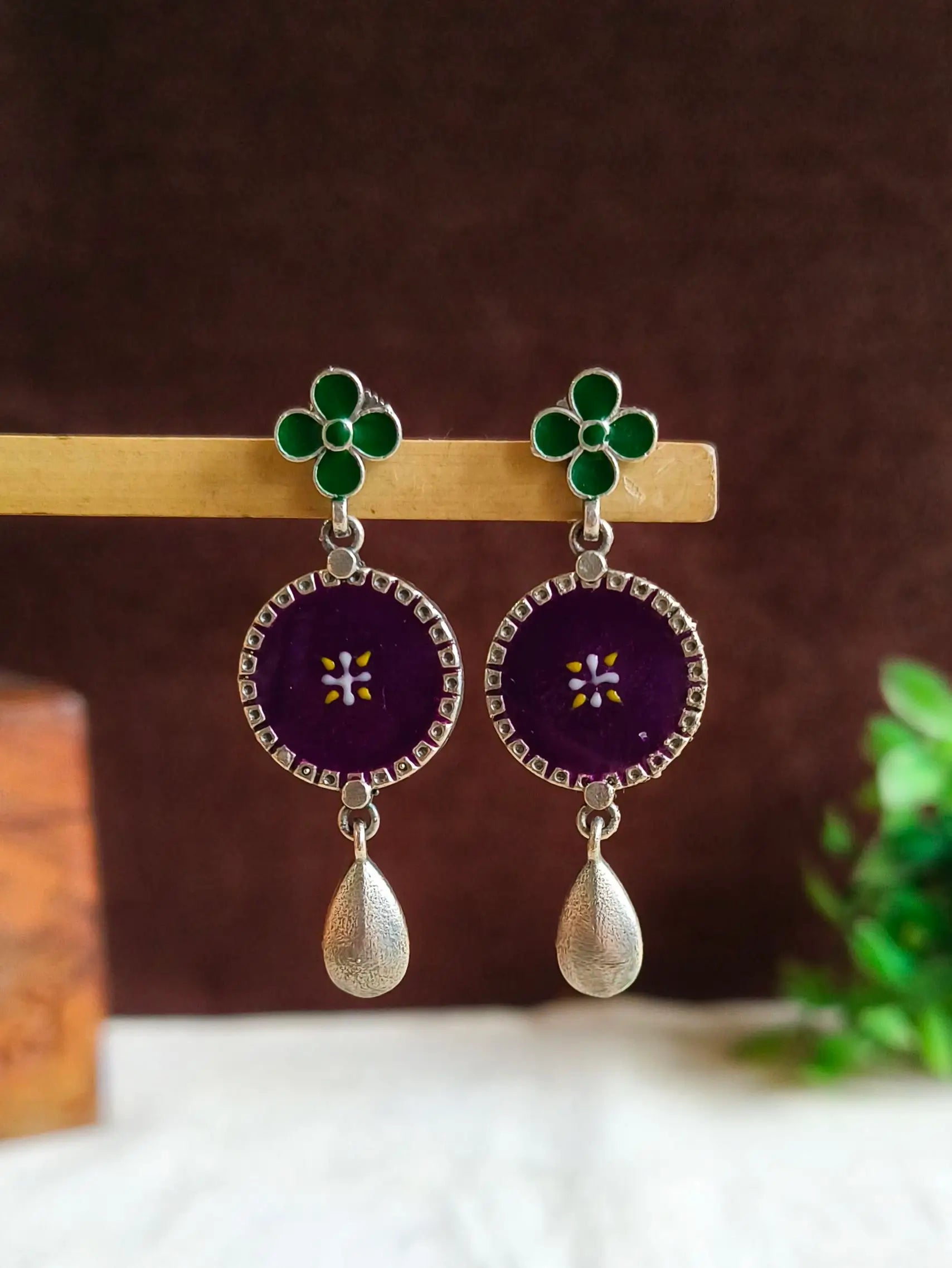 Add artistic charm to your look with these Handpainted Minakari Oxidized Dangler Earrings, crafted with a rich antique silver finish. Each piece features intricate handpainted minakari work, vibrant colors, and detailed motifs that create a perfect blend of tradition and elegance. Ideal for festive occasions, parties, daily wear, casual outings, or office styling, these lightweight earrings offer all-day comfort. They also make a beautiful and thoughtful gift for art and jewelry lovers. Style them with kurtis, sarees, lehengas, Indo-fusion outfits, or boho dresses for a unique and eye-catching statement.