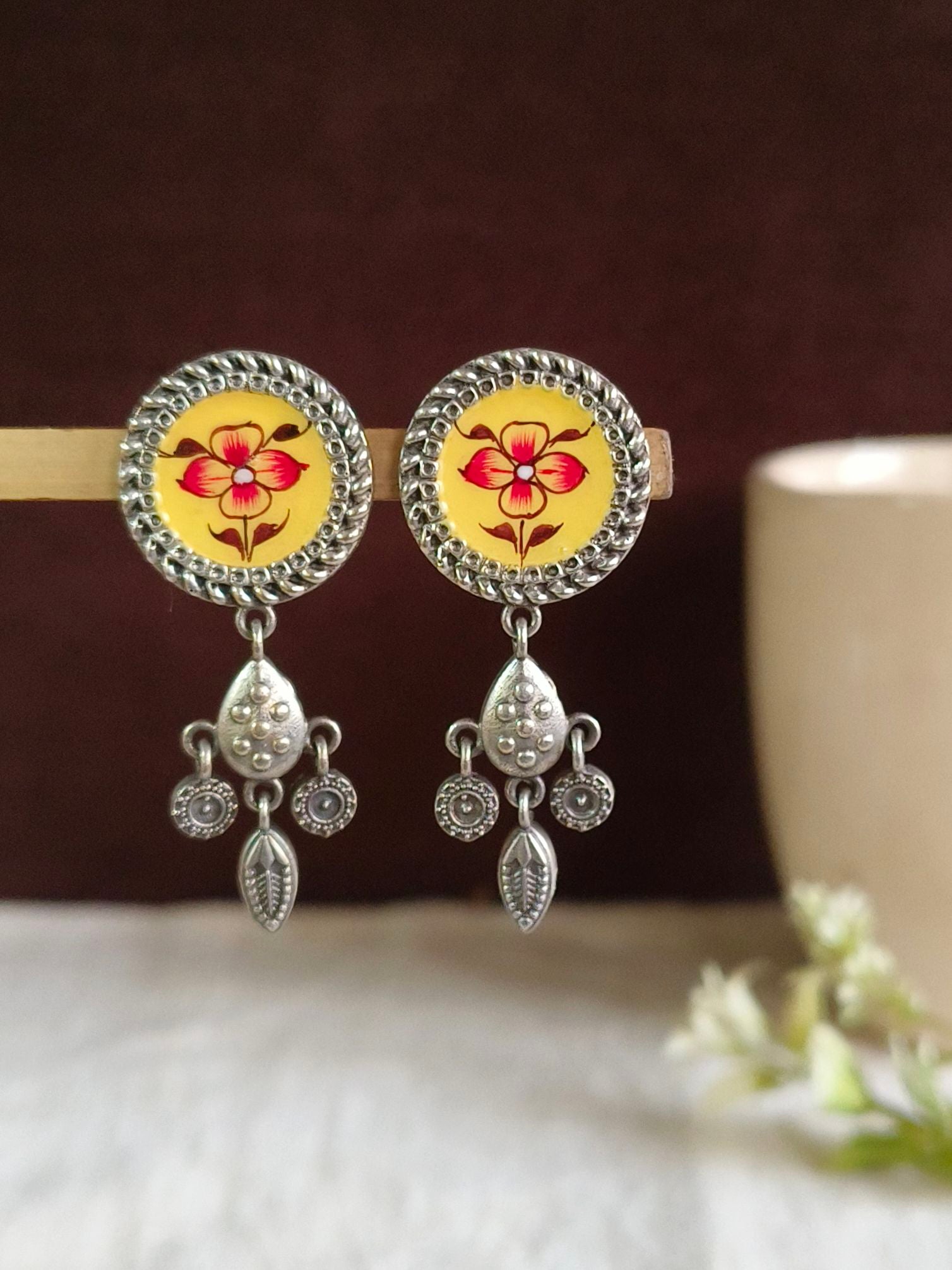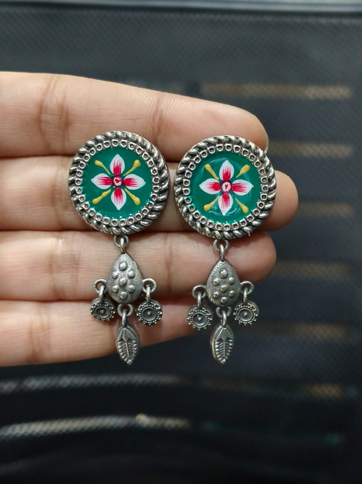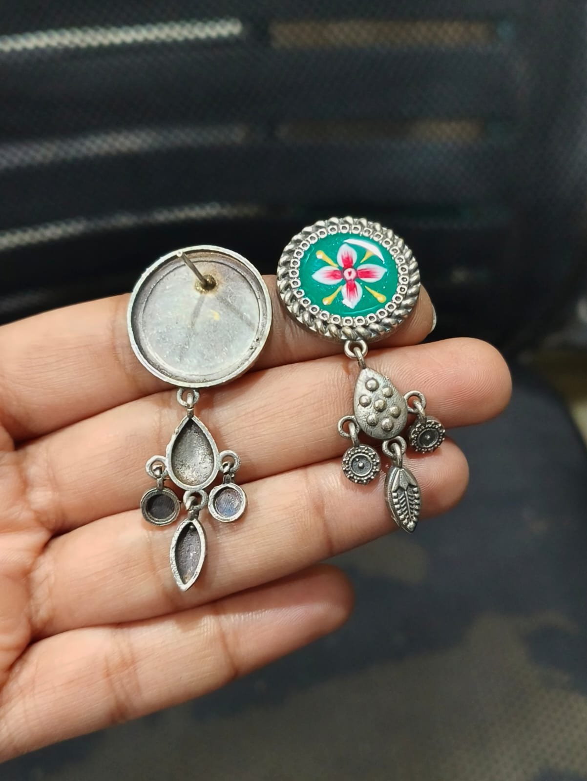 Make a statement with these handcrafted oxidised Meenakari round dangler earrings, featuring exquisite hand-painted enamel detailing and a charming finish. Perfect for any festive or ethnic occasion, these earrings add a touch of tradition and elegance.