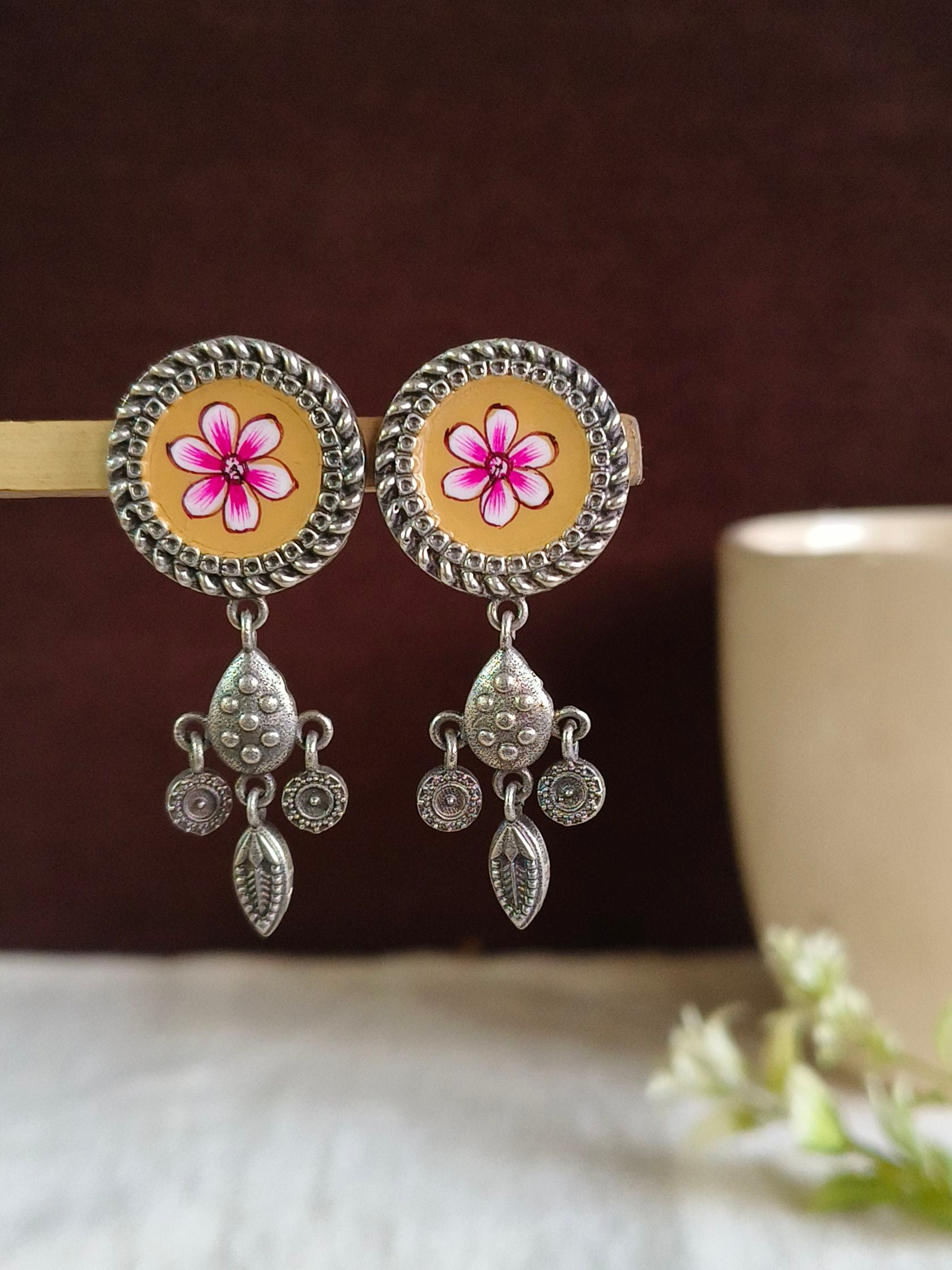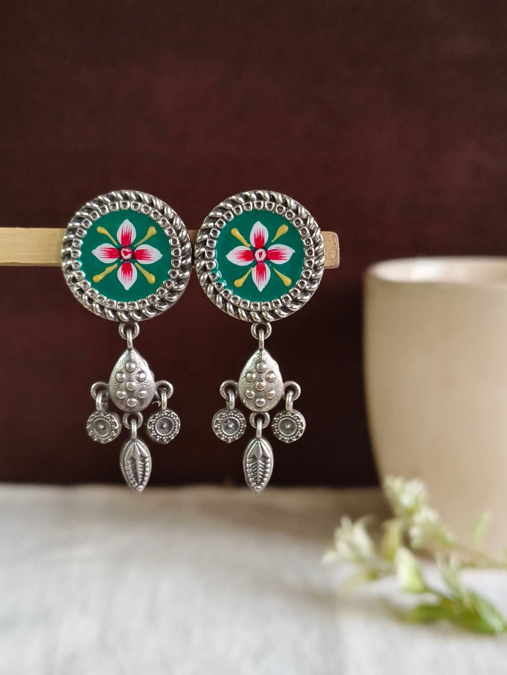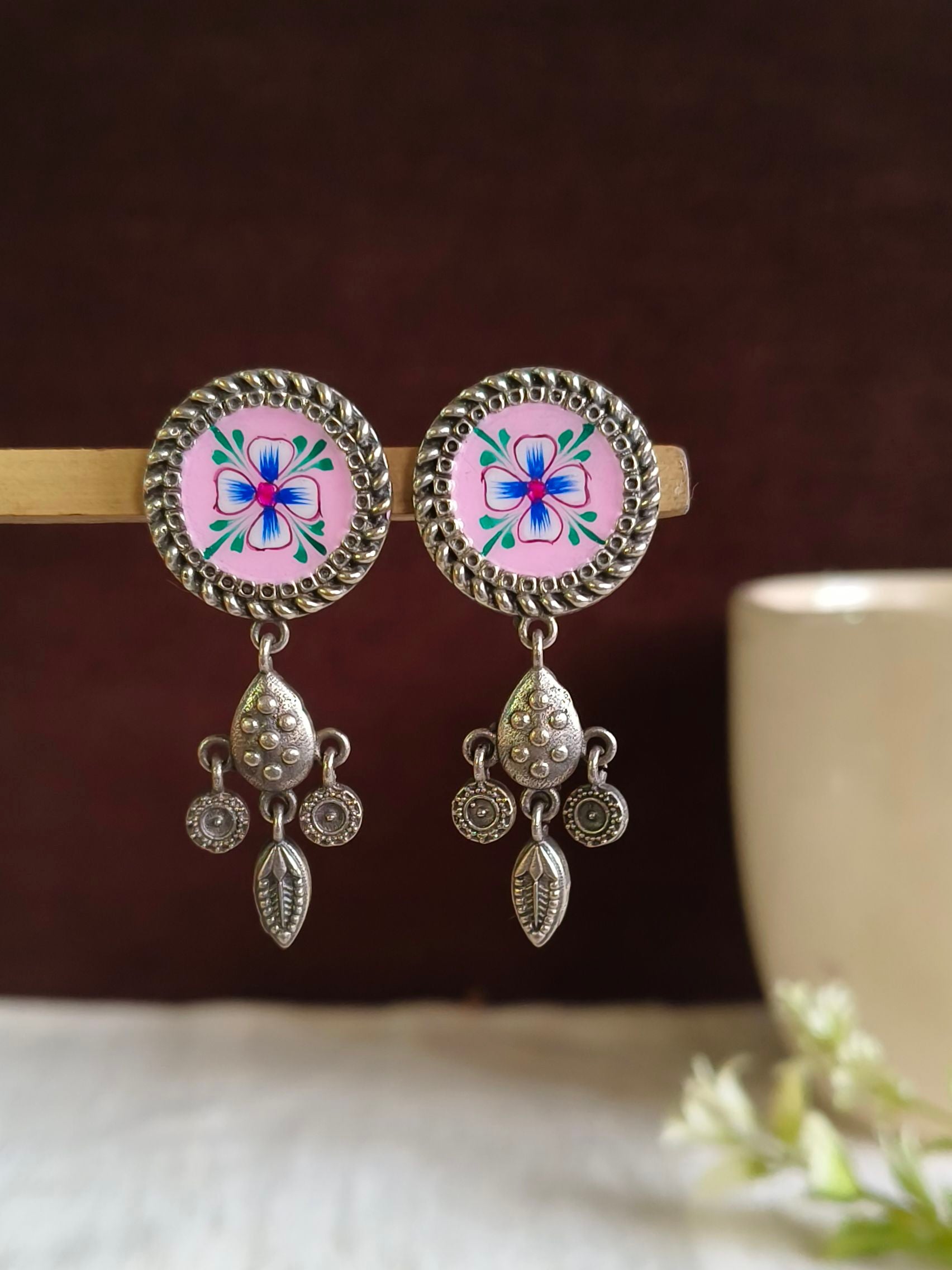Make a statement with these handcrafted oxidised Meenakari round dangler earrings, featuring exquisite hand-painted enamel detailing and a charming finish. Perfect for any festive or ethnic occasion, these earrings add a touch of tradition and elegance.