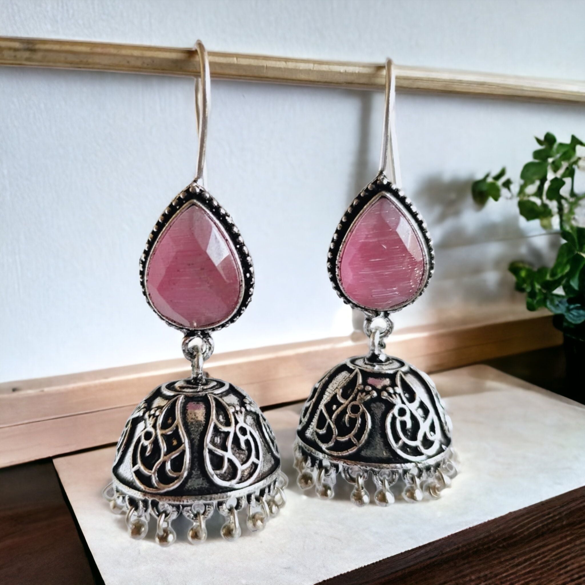 Improve your style by putting on our Oxidized Silver Black Jhumka. Made with precision from sturdy brass, and featuring sleek sterling silver plating. These earrings were created to be a standout. The intricately oxidized details with striking stones make for a stylish style that effortlessly blends modern fashion with old-fashioned charm.