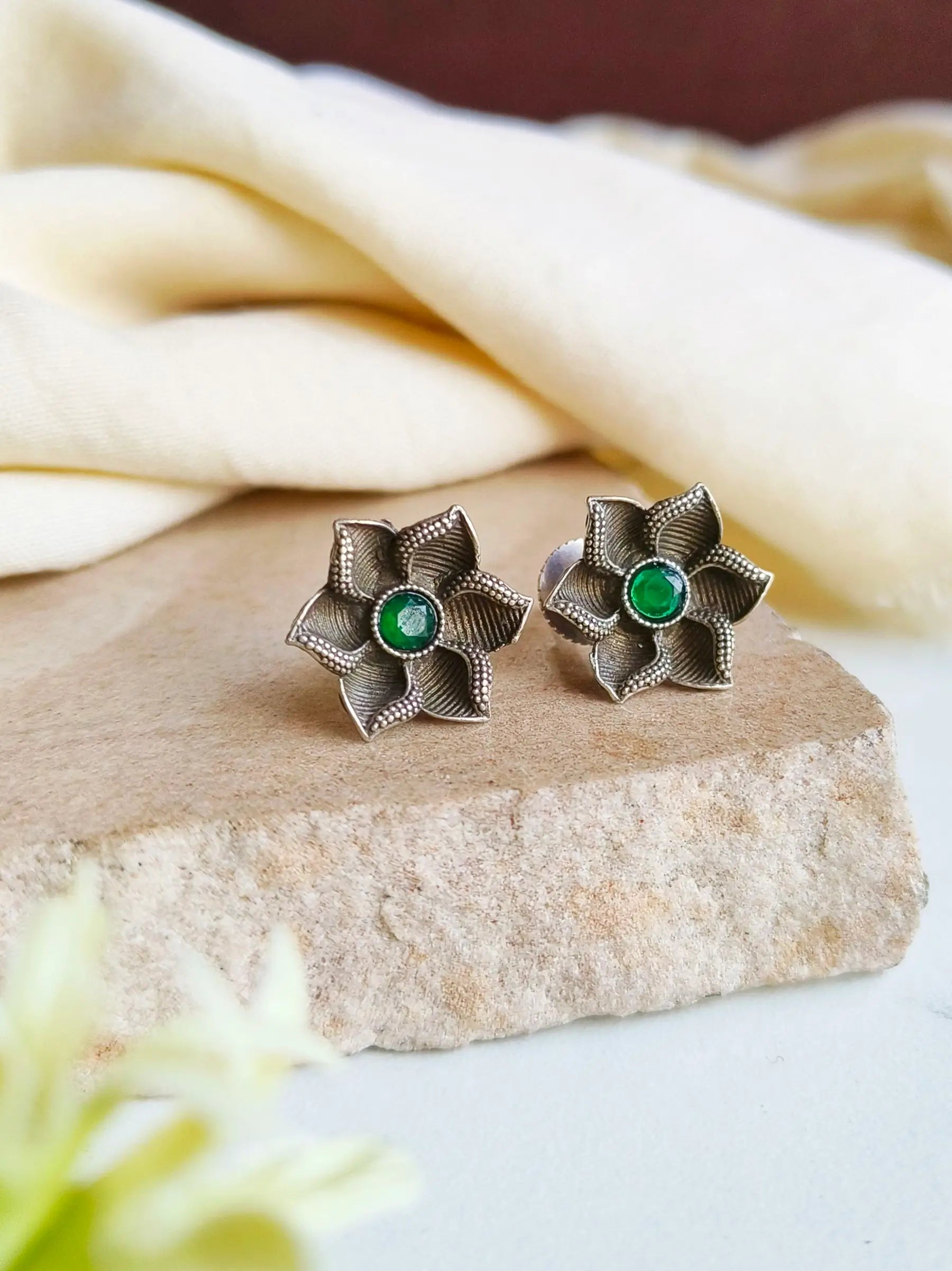 These lightweight oxidised silver floral studs are a perfect blend of style and comfort. A must-have accessory for those seeking timeless elegance in daily wear.