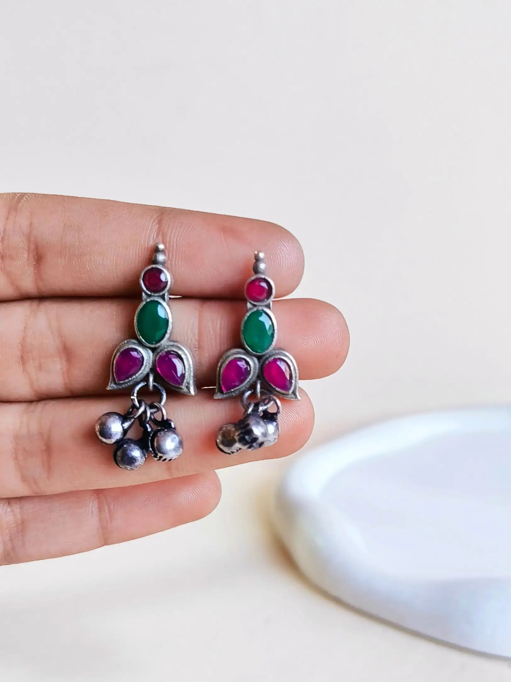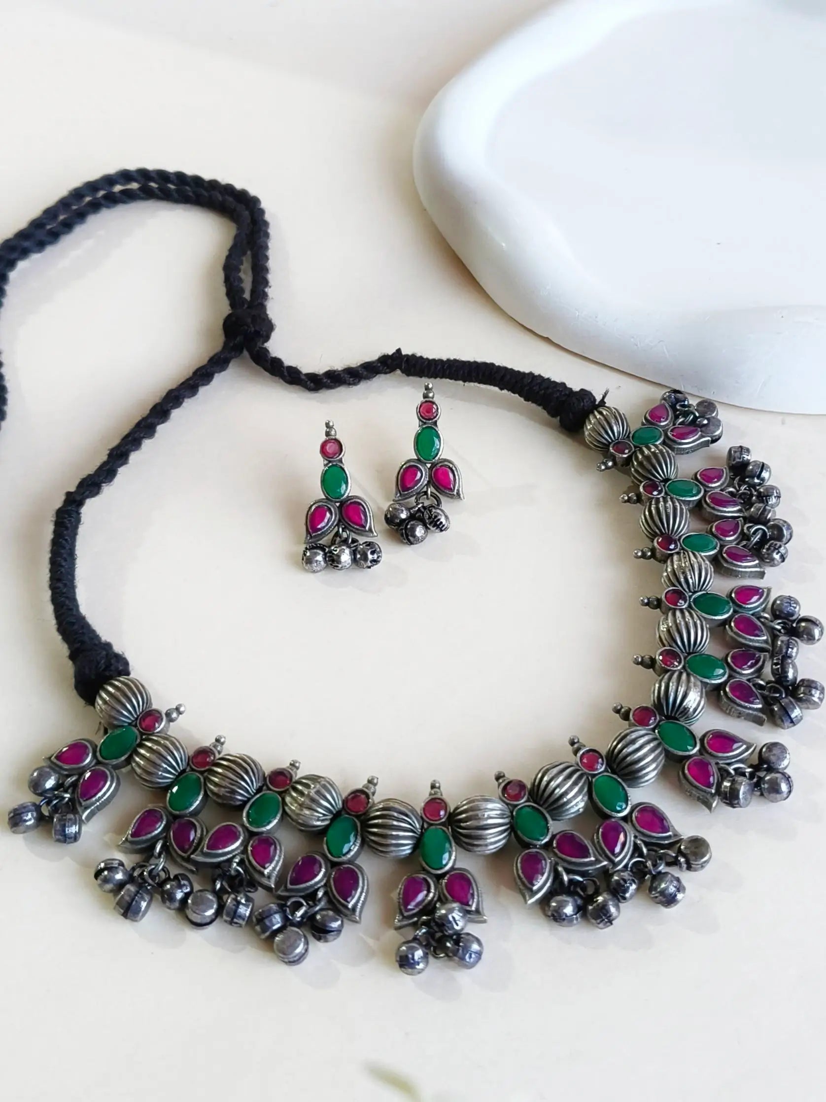 Celebrate the festive spirit of Navratri with this Oxidised Silver Look-Alike Necklace Set, a perfect blend of tradition and elegance. Its intricate design and ghungroo accents make it an ideal accessory for ethnic celebrations.
