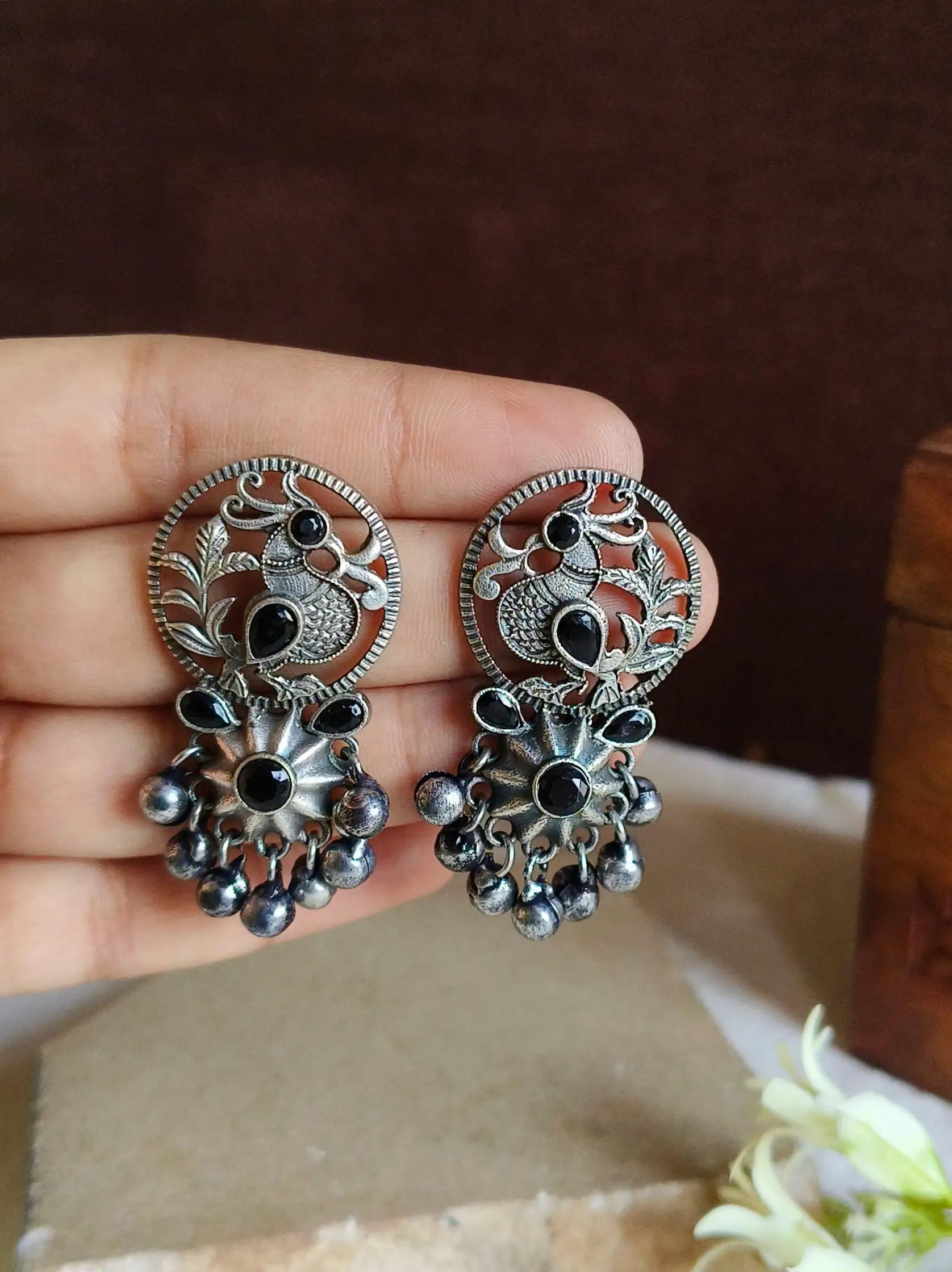 Add timeless charm to your look with these oxidised silver-plated earrings featuring a bold red stone that enhances their elegant appeal. The intricate detailing adds a classic touch, making them perfect for daily wear, office outings, parties, and festive occasions. These earrings also make a thoughtful gift for loved ones. Style them with traditional outfits, fusion wear, or even chic western looks to elevate your ensemble effortlessly.