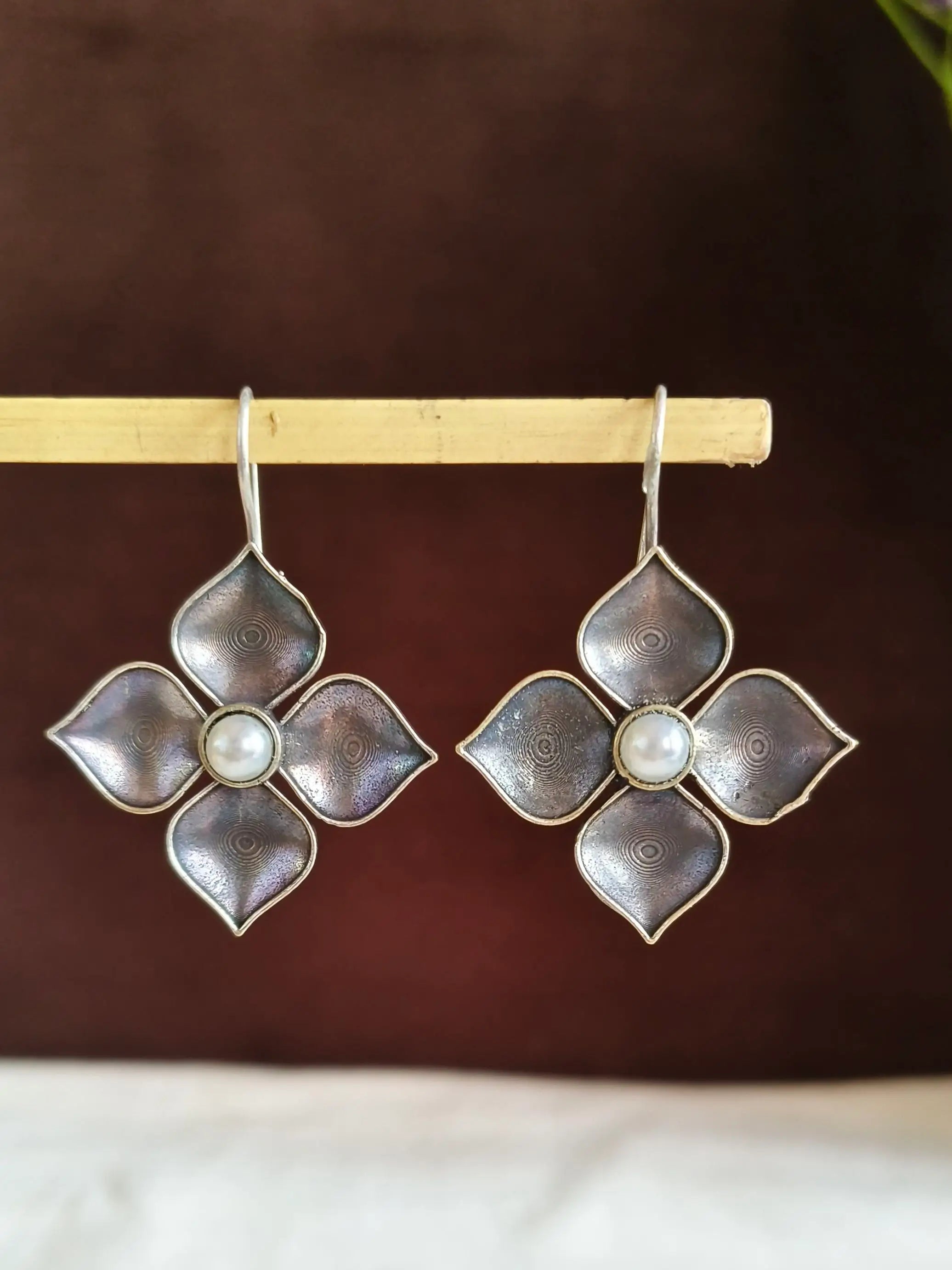 Elevate your everyday look with these stunning oxidized floral earrings from Sarichka Fashion. Featuring a unique four-petal flower design with a textured silver finish and a radiant white pearl in the center, these earrings offer a perfect blend of tradition and modern charm.