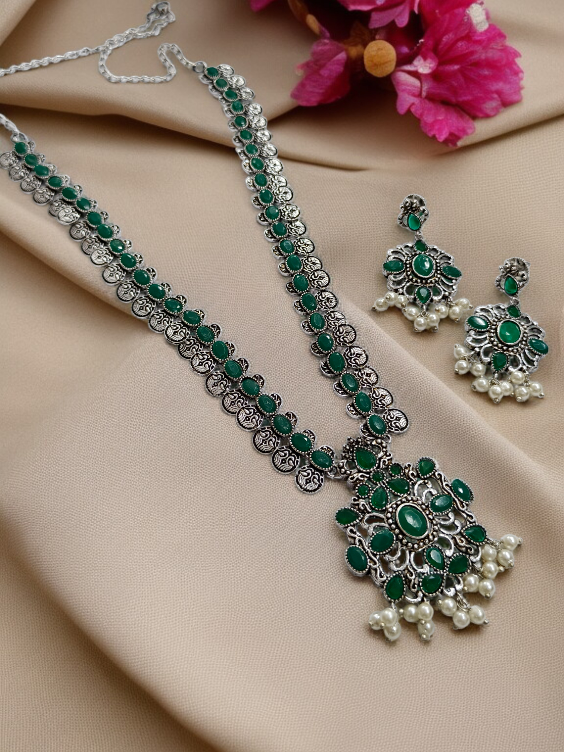 The Ruby Long Oxidized Necklace It is an eye-catching piece that blends classic style with contemporary sophisticated. This stunning necklace is constructed with premium brass, and then completed with a stunning silver plating that guarantees the durability of this piece and an attractive appearance. It is adorned with sparkling gemstones This Long Oxidized Necklace gives a splash of color and grace and is the ideal accessory for any event.