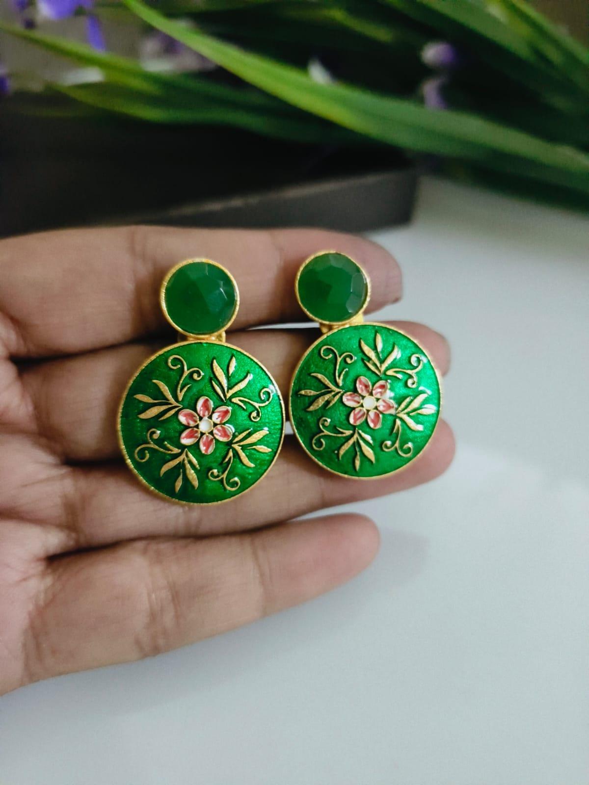 Perfect for parties, these contemporary earrings feature hand-painted detailing, adding a unique charm to your look. Despite their lavish appearance, they're surprisingly lightweight and comfortable to wear, ensuring you can dance the night away without any discomfort. Whether you're attending a special event or simply want to make a statement, these earrings effortlessly blend traditional artistry with modern flair, making them a must-have accessory for any fashion-forward individual.