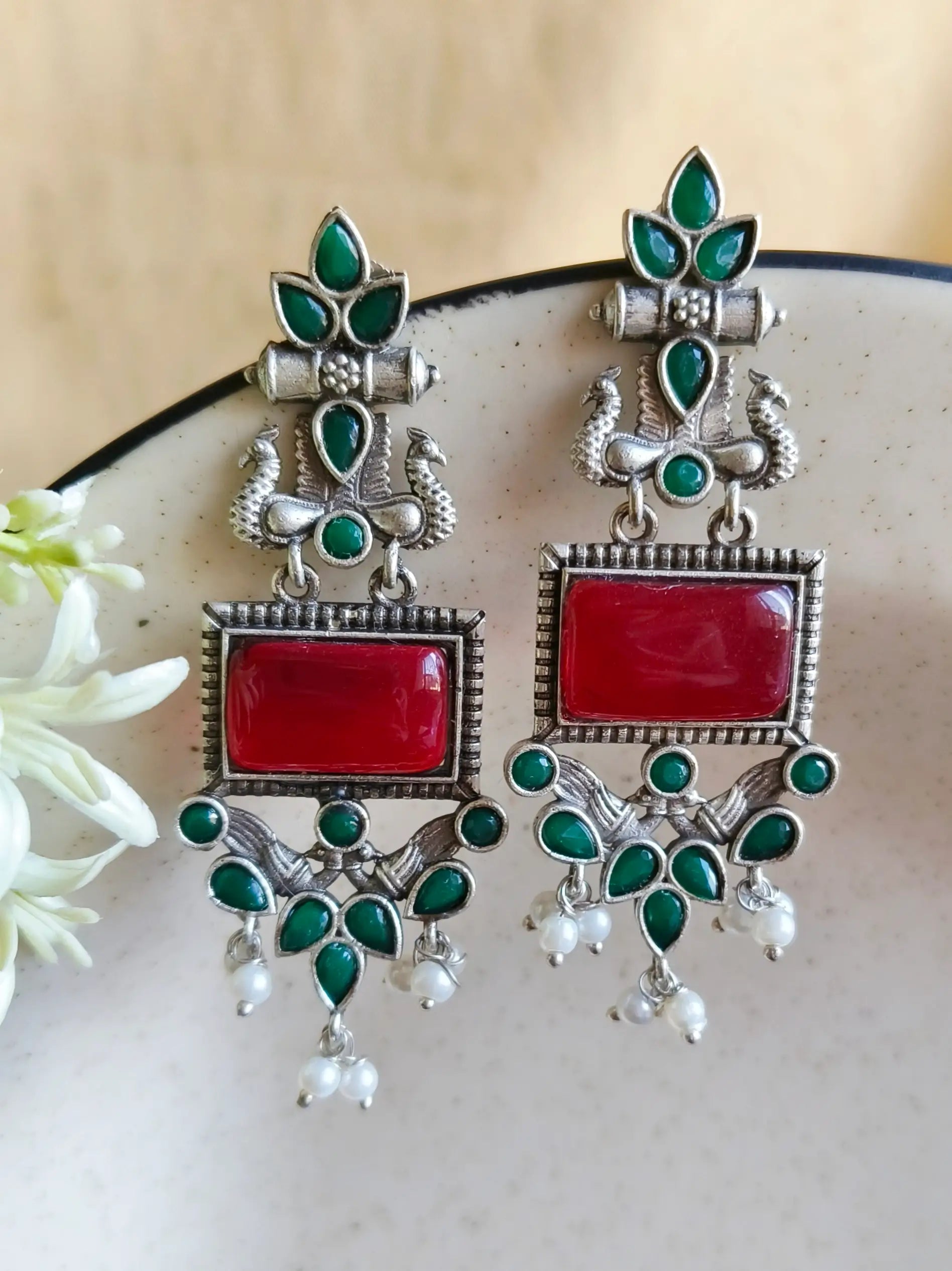 These silver look-alike dangler earrings effortlessly enhance your ethnic wardrobe, offering versatility, lightweight comfort, and a touch of elegance for any occasion.