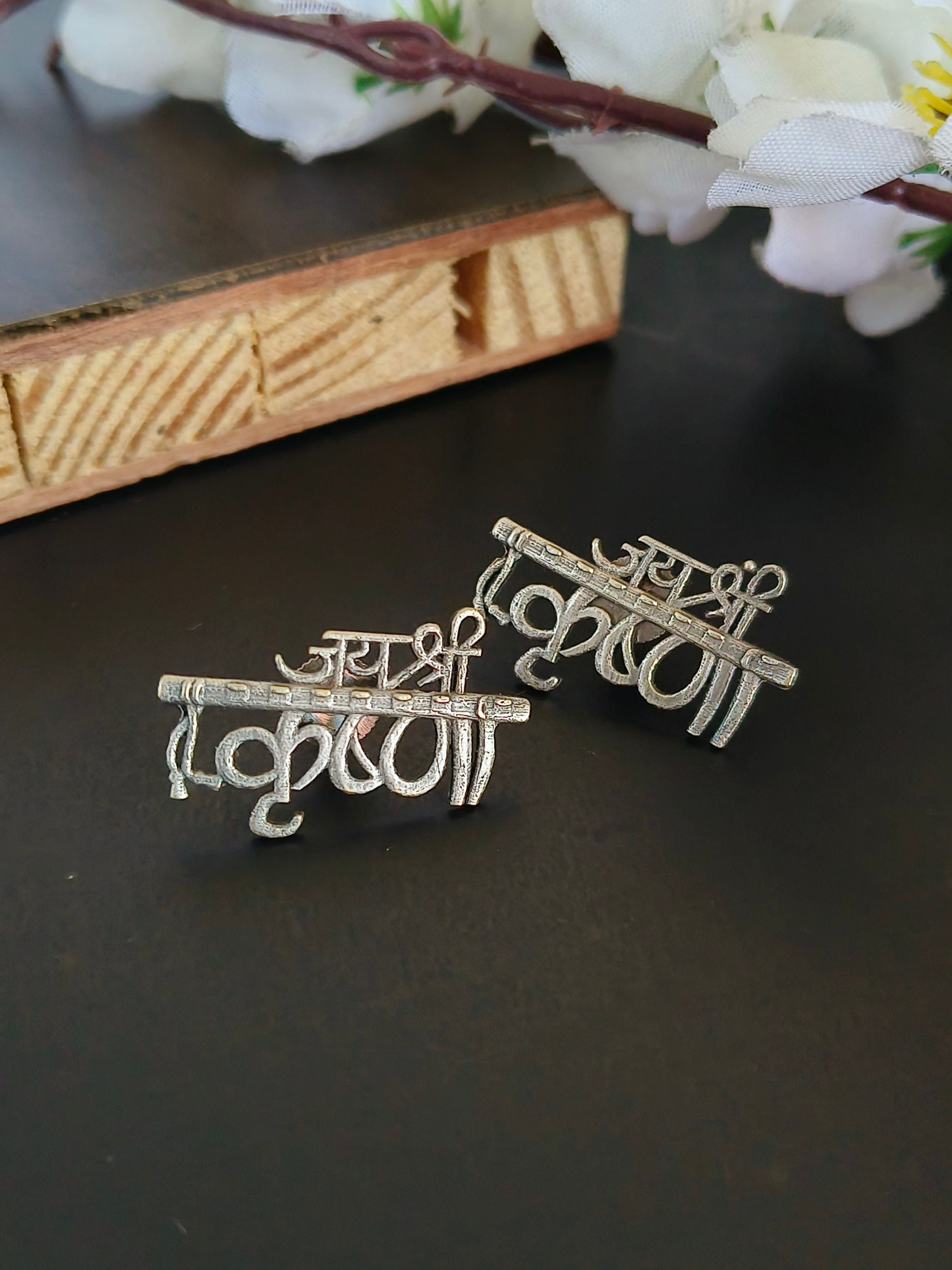 Silver Look-Alike Jai Shree Krishna Stud Earrings for Daily Wear | Sarichka