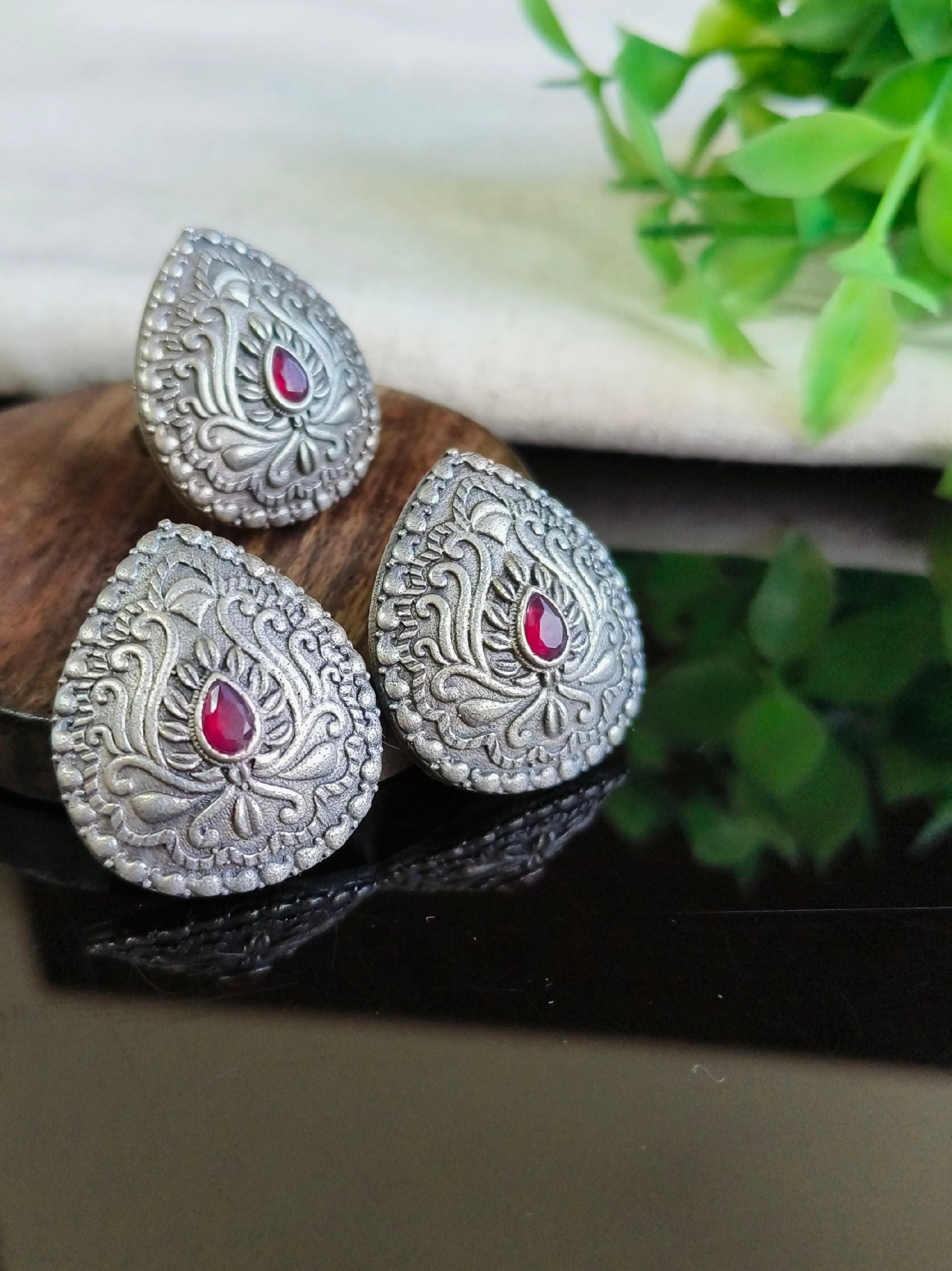 Elevate your casual style with this exquisite silver look-alike jewelry set featuring pan-shaped stud earrings and a matching adjustable finger ring. The minimal yet elegant design is perfect for casual outings or everyday wear.
