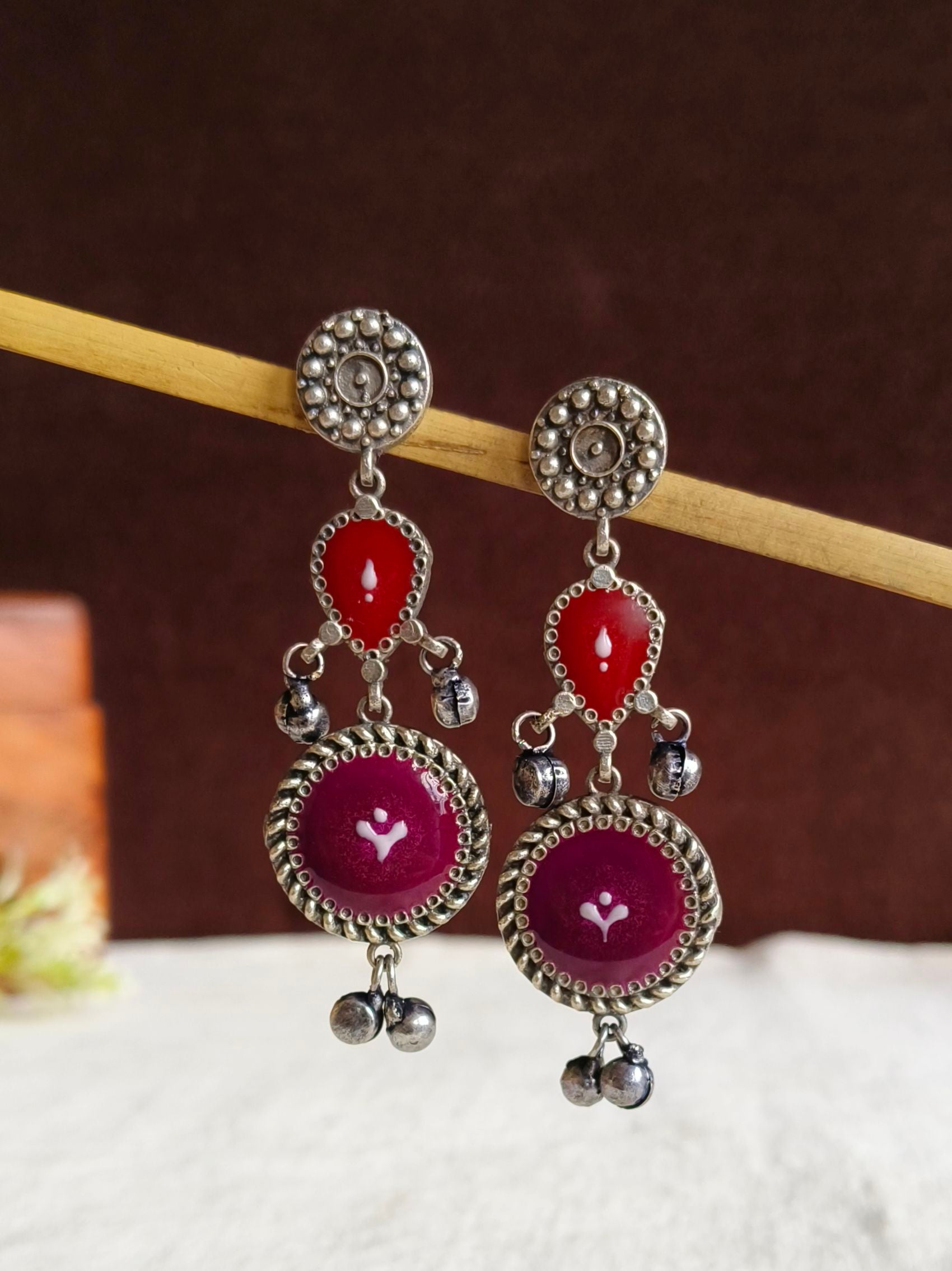 Elevate your look with these stunning Silver Polish Hand-Painted Meenakari Dangler Earrings from Sarichka. Designed with intricate artistry, these earrings blend tradition with modern elegance.