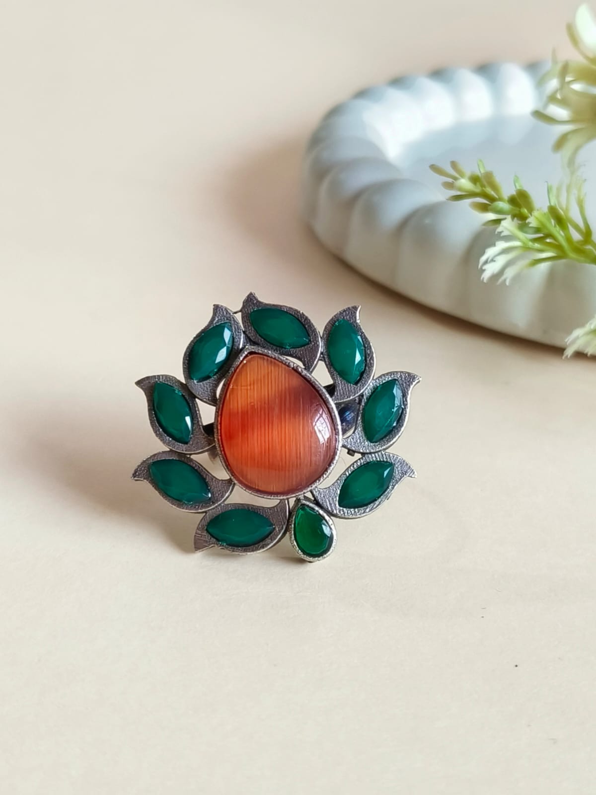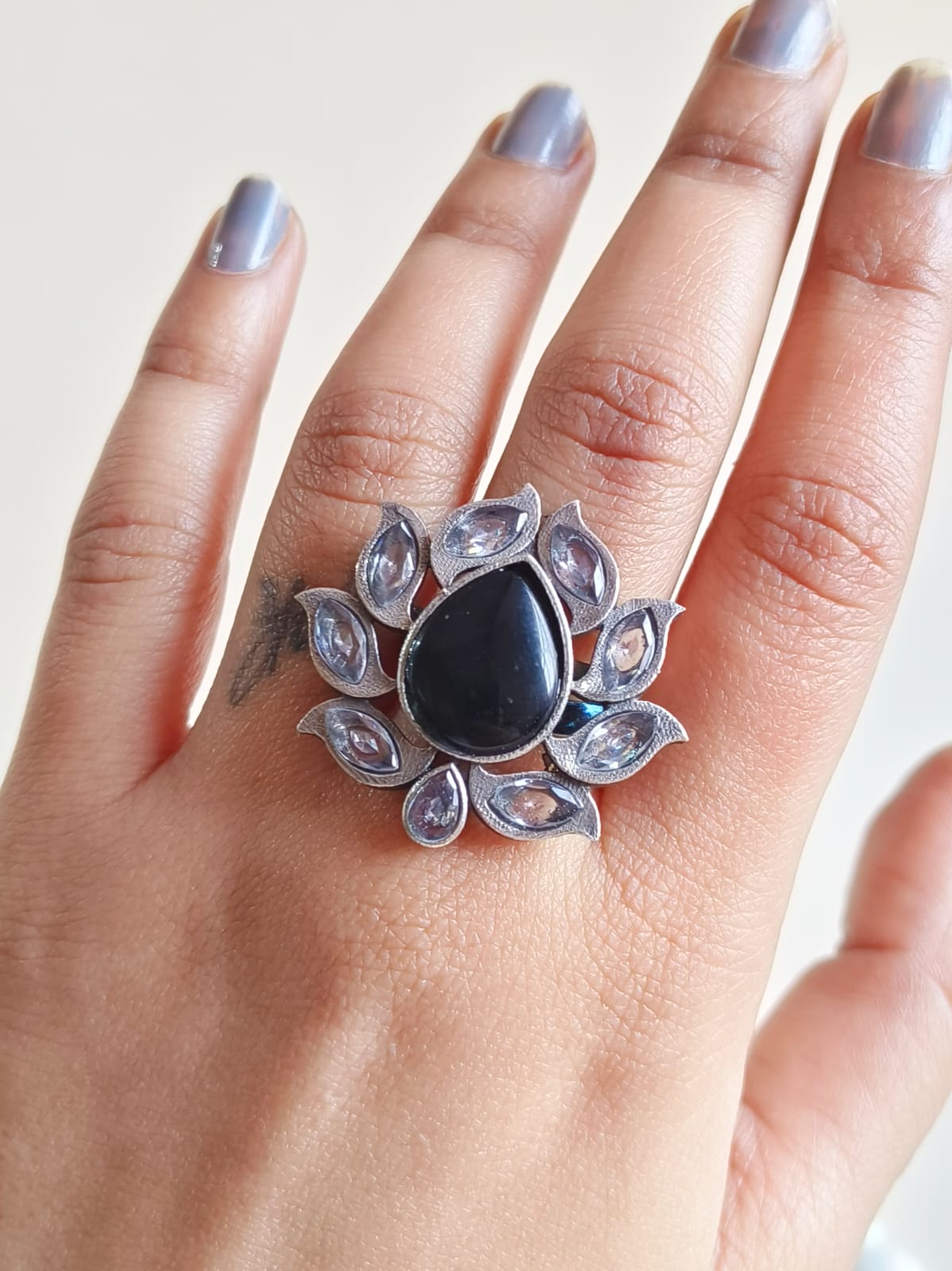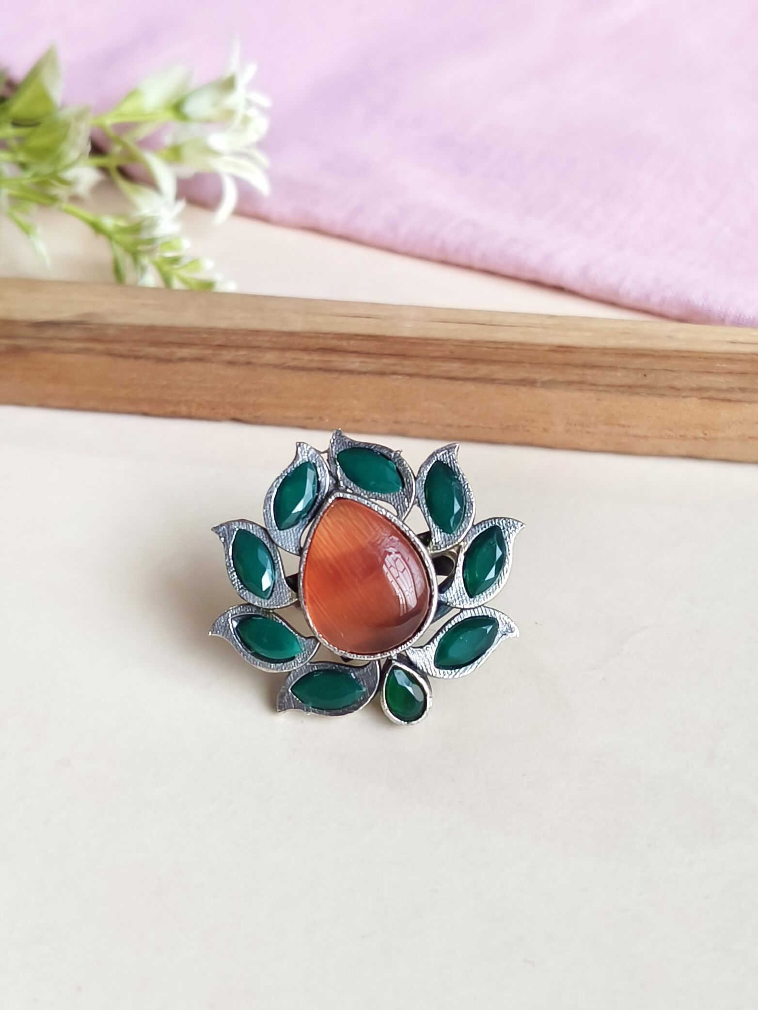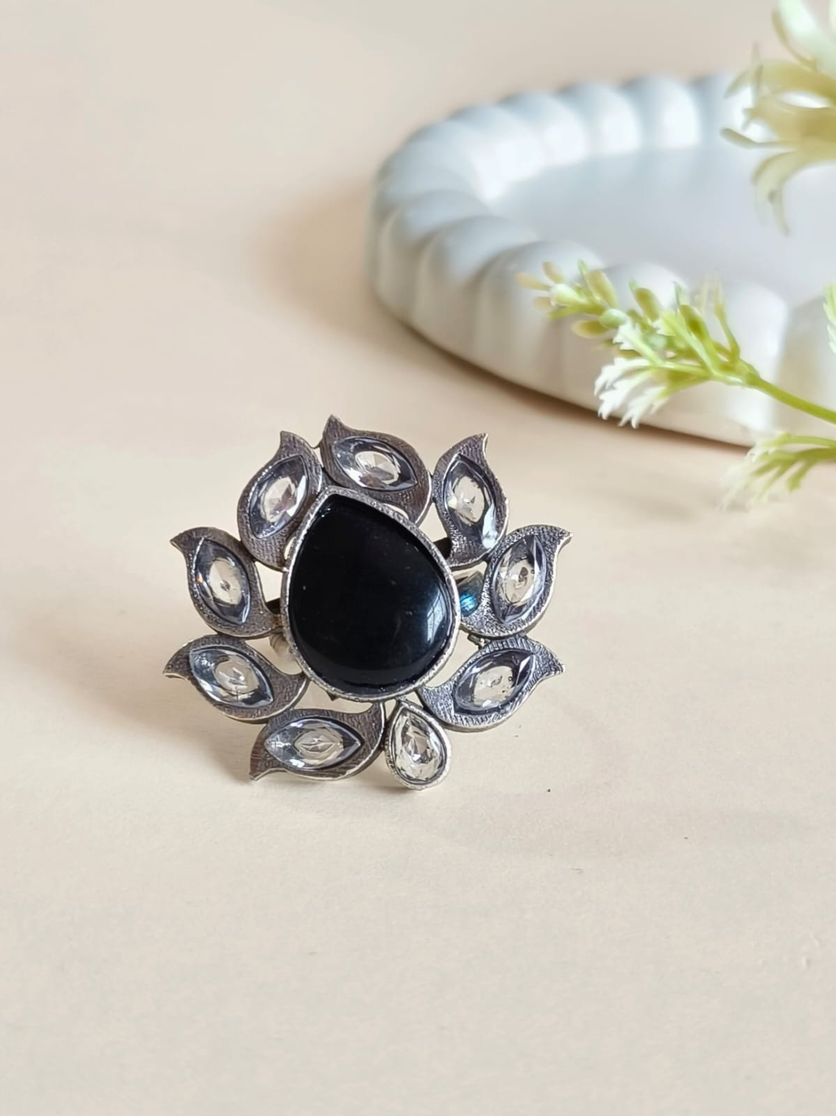 Improve your style by putting on our Stone Stud Lotus Oxidised Rings. Made with precision from sturdy brass, and featuring sleek sterling silver plating. These rings were created to be a standout. The intricately oxidized details with striking stones make for a stylish style that blends modern fashion with old-fashioned charm.