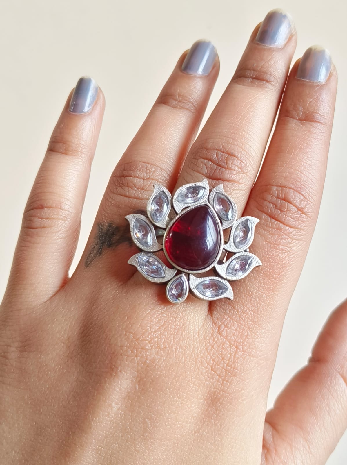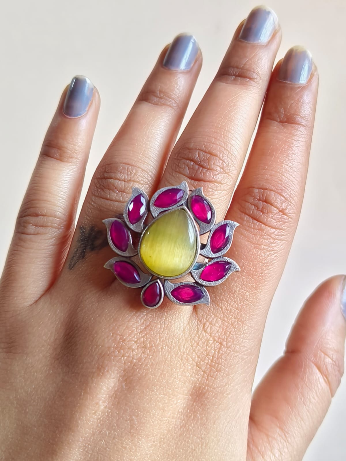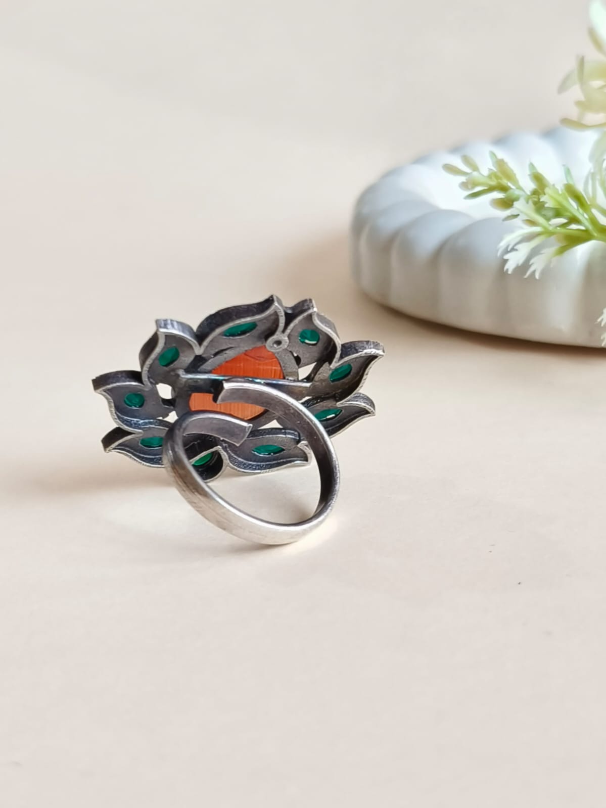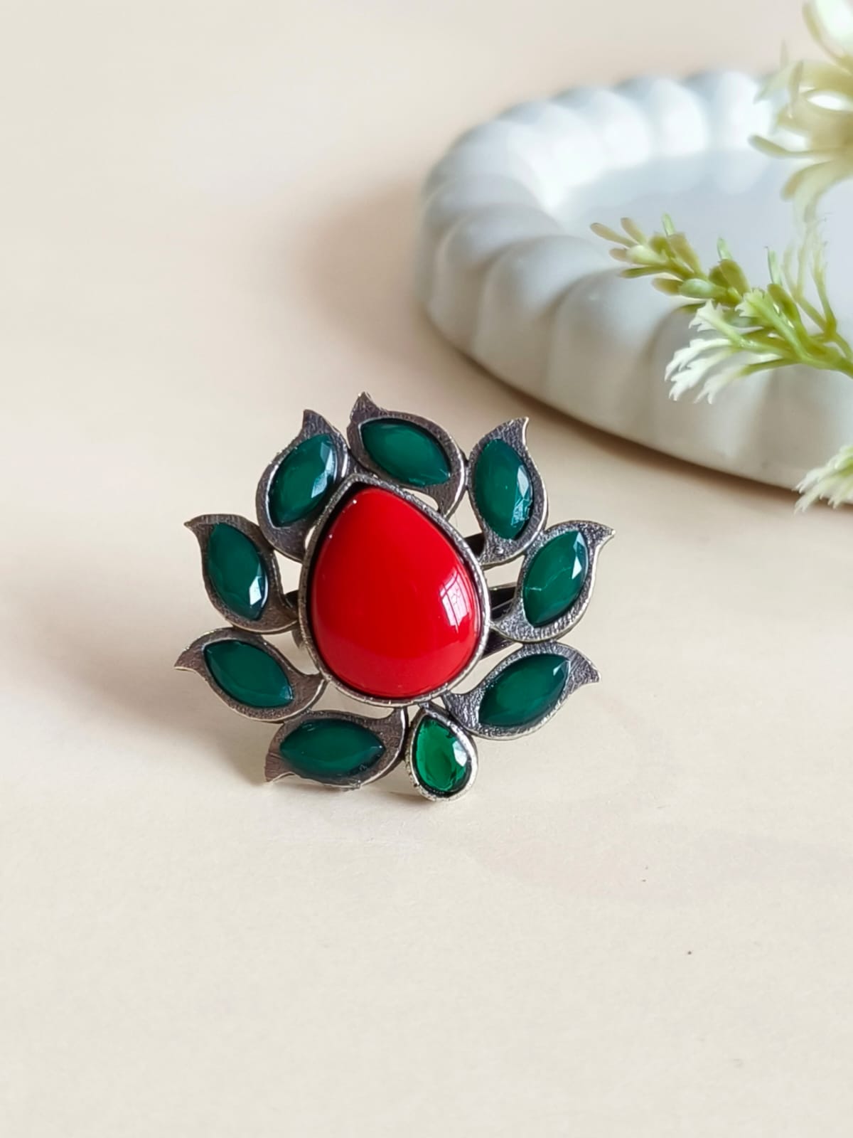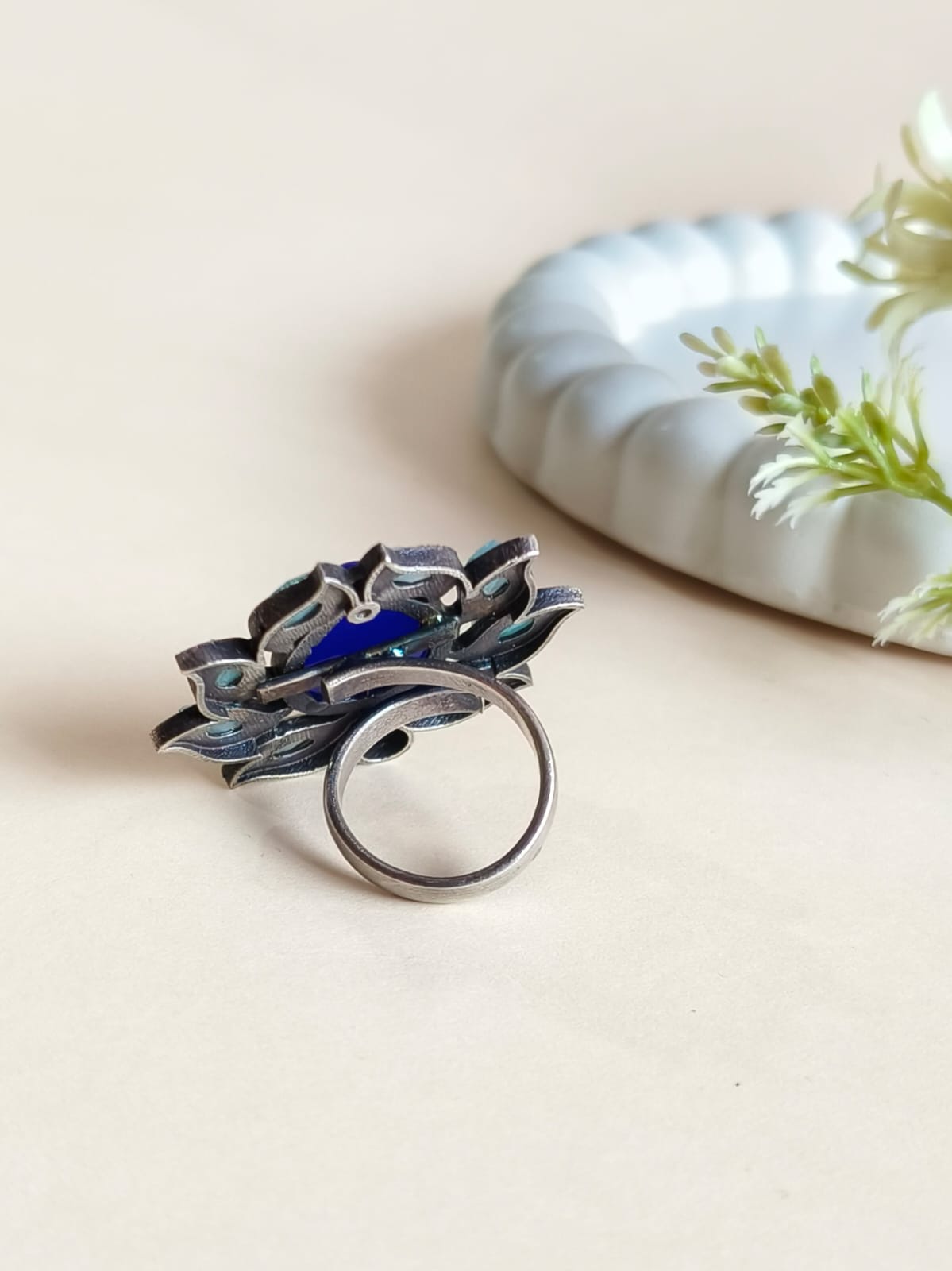 Improve your style by putting on our Stone Stud Lotus Oxidised Rings. Made with precision from sturdy brass, and featuring sleek sterling silver plating. These rings were created to be a standout. The intricately oxidized details with striking stones make for a stylish style that blends modern fashion with old-fashioned charm.