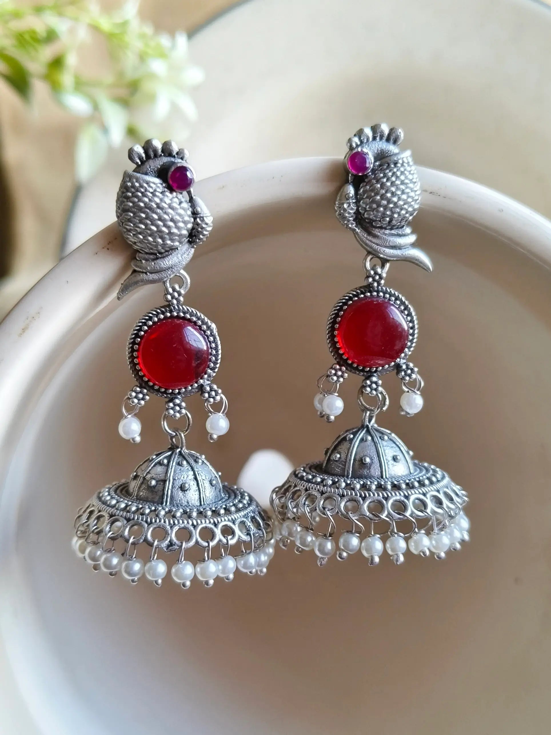 These stunning silver replica peacock jhumka earrings blend intricate detailing with timeless beauty, making them the perfect accessory for any grand occasion. The Monalisa stones and pearl drops elevate their elegance, ensuring you stand out.